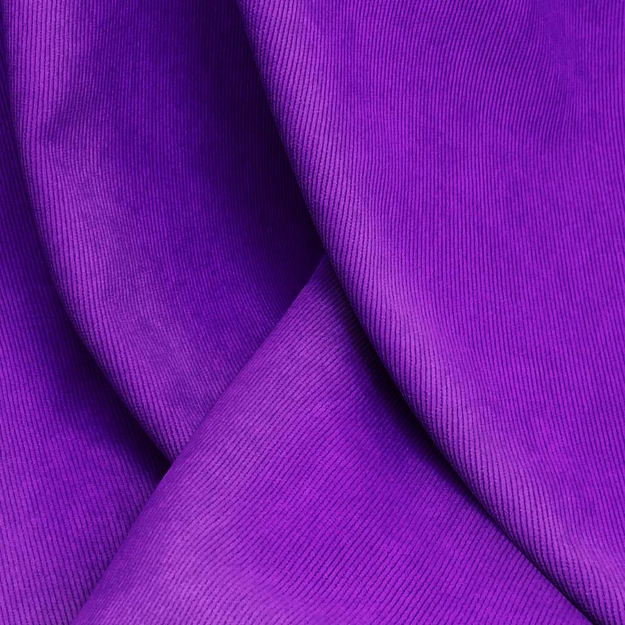 La tela base es la Pana Aterciopelada-Dublin de composición 85% Poliéster, 12% Poliamida, 3% Elastano. Posee una textura y tacto suave, además de ser de un visual brillante. El color liso impreso es Morado-Purple Strong con un CMYK de 80 93 0 0. Este color primario es un tono oscuro de magenta con una fuerte presencia de azul y rojo, lo que crea un efecto visual dramático y elegante. Este tono se combina bien con otros tonos oscuros y ricos, en particular con negro, plateado, oro y gris oscuro. La tela está impresa con el color liso a una sola cara por impresión digital textil, siendo importante destacar que no es un tejido tintado sino impreso por una sola cara.