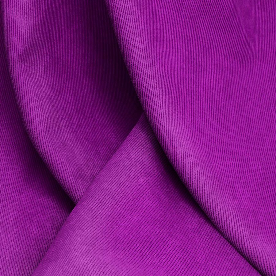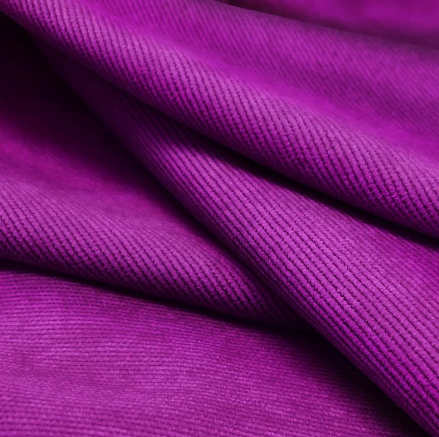 La tela base es la Pana Aterciopelada - Dublin, con una composición de 85% POLIÉSTER, 12% POLIAMIDA, 3% ELASTANO y un gramaje de 280 gr/m2. El color liso impreso es un Morado-purpura real, con un CMYK de 64 100 4 1, lo que significa que predominan los tonos magenta y cian, con una pequeña cantidad de amarillo y negro para lograr una mayor profundidad en el tono.