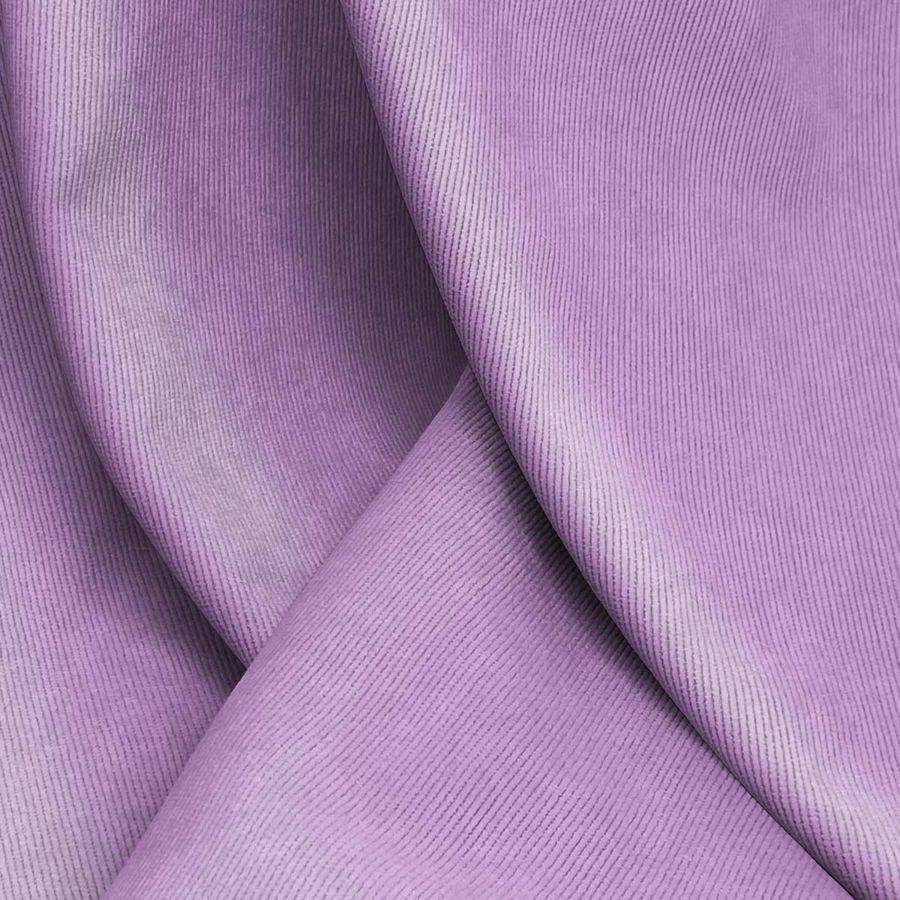 La tela base, Pana Aterciopelada - Dublin, es una pana con composición de 85% poliéster, 12% poliamida y 3% elastano, con un gramaje de 280 gr/m2 y un ancho de 150 cm. El color liso impreso en esta tela base es morado-violeta africana, con un CMYK de 35 55 0 0, lo que significa que está compuesto principalmente por tintas cian y magenta. Este color secundario transmite misterio y sofisticación, evocando a la elegancia y la originalidad. Combina en particular con otros colores como el amarillo mostaza, el rosa cuarzo, el verde oscuro o el gris carbón.