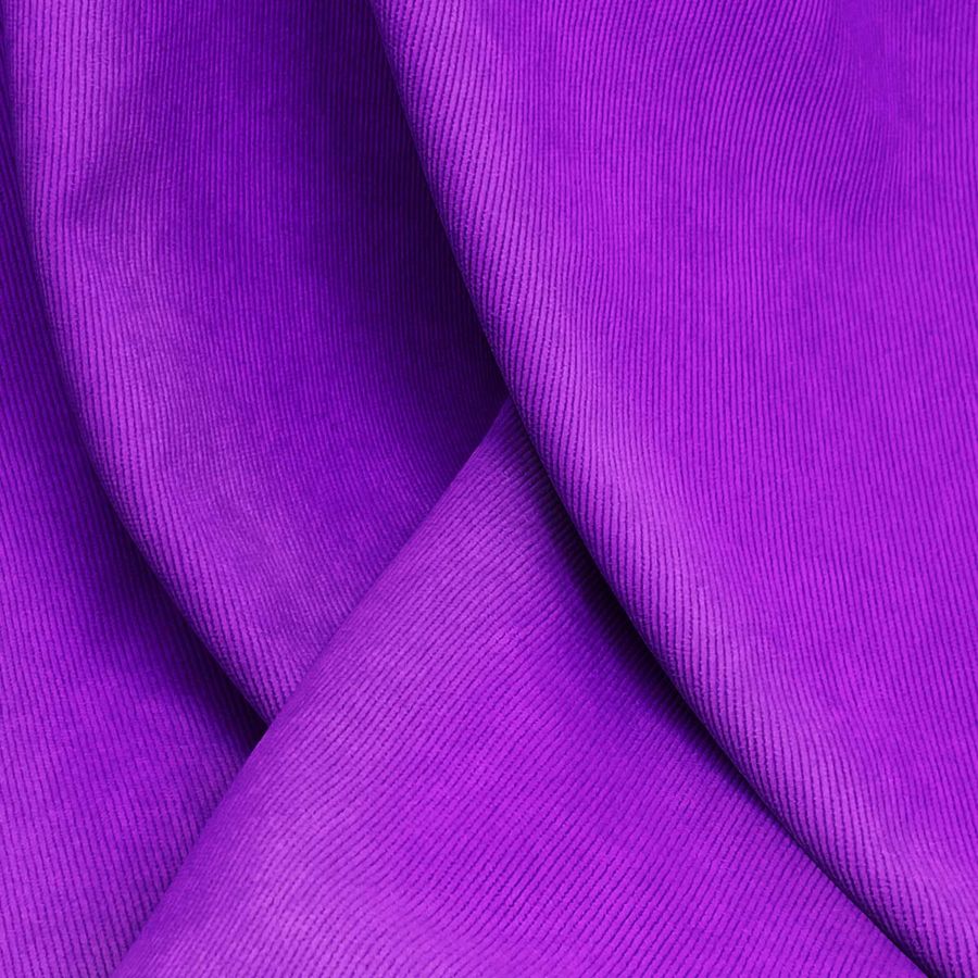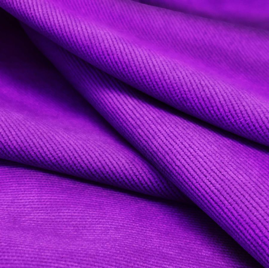 La tela base es la Pana Aterciopelada - Dublin, compuesta por un 85% de poliéster, un 12% de poliamida y un 3% de elastano. Su gramaje es de 280 gr/m2 y tiene un ancho de 150 cm. El color liso impreso en la tela es Morado/Violeta Francés, con un valor de CMYK de 73 85 0 0. Este color combina bien con tonos grises, blancos y cremas.