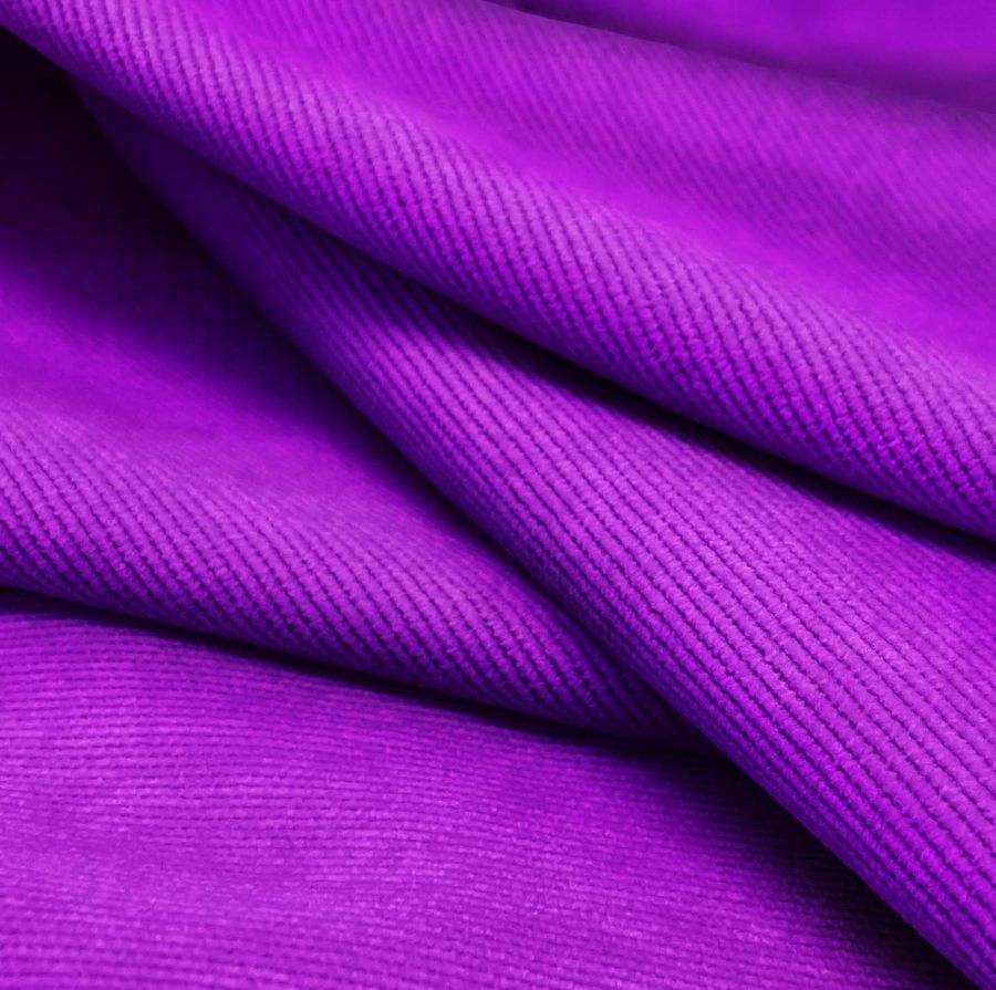 La tela base de este tejido es la Pana Aterciopelada - Dublin, compuesta por un 85% de poliéster, un 12% de poliamida y un 3% de elastano, con un gramaje de 280 gr/m2 y un ancho de 150 cm. El color liso impreso es de tonalidad morada y violeta oscuro, obtenido con una impresión digital textil a una sola cara. El CMYK del color liso indicado es de 70 85 0 0.
