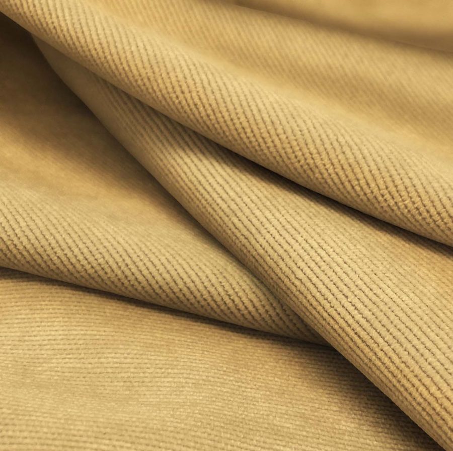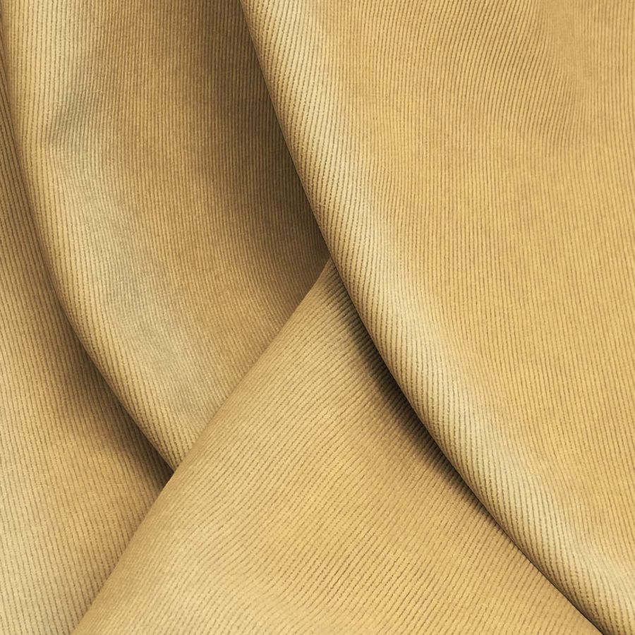 La tela base es la Pana Aterciopelada - Dublin, compuesta por 85% de poliéster, 12% de poliamida y 3% de elastano, con un peso de 280 gr/m2 y una anchura de 150 cm. Su color liso impreso es una tonalidad de naranja-dorado, con una mezcla de tinta cian del 10%, magenta del 34%, amarilla del 65% y negro del 1%, representando un CMYK de 10 34 65 1. Este color evoca sentimientos de alegría, prosperidad y elegancia. Combina bien con tonos neutros como beige y blanco para crear una armonía de colores equilibrada. La tela está impresa con el color liso en una sola cara utilizando la tecnología de impresión digital textil.