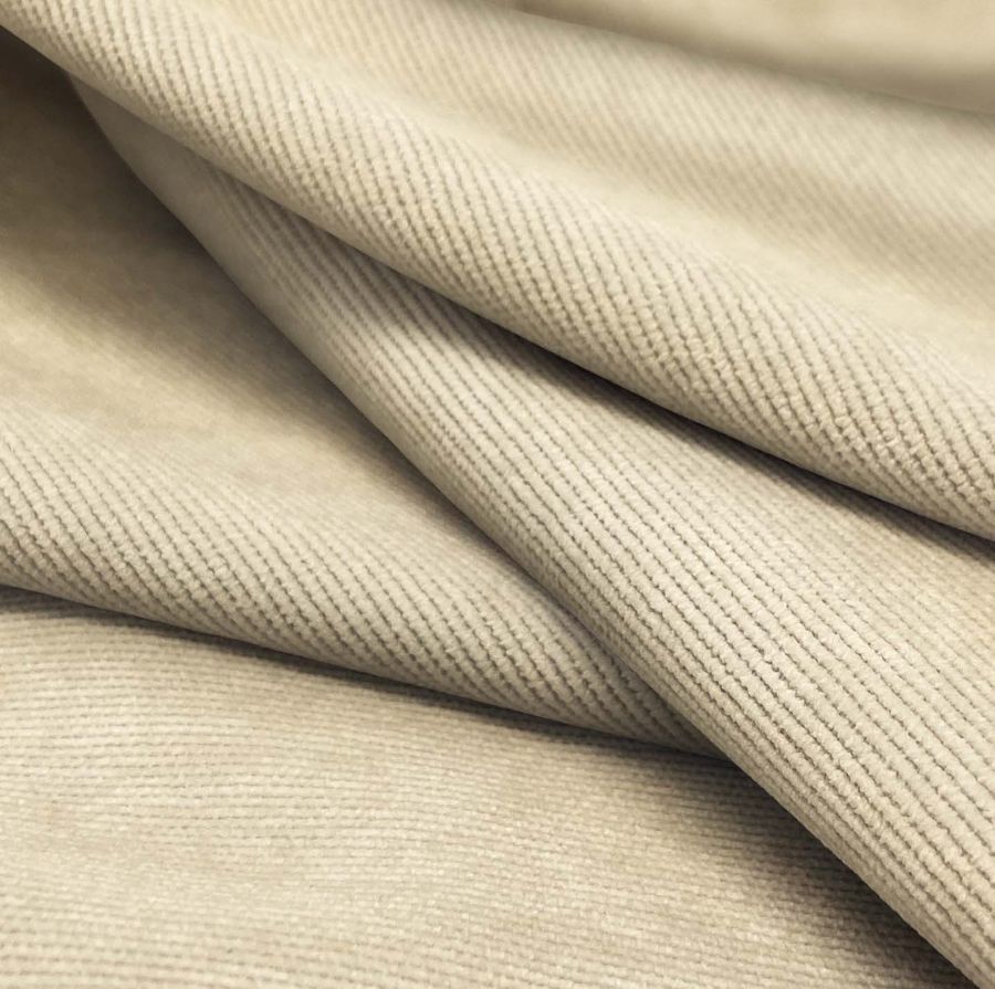 La tela base, Pana Aterciopelada - Dublin, es una pana compuesta por 85% poliéster, 12% poliamida, 3% elastano, con 280 gr/m2 de gramaje y 150 cm de ancho. El color base es un naranja melocotón amarillo impreso con un CMYK de 2 12 32 0. Este color secundario destaca por su tonalidad cálida y suave que evoca paz y tranquilidad. Esta tonalidad combina muy bien con tonos neutros como el blanco, beige o gris pálido, y también con tonalidades más oscuras como el marrón, verde oliva o gris oscuro.