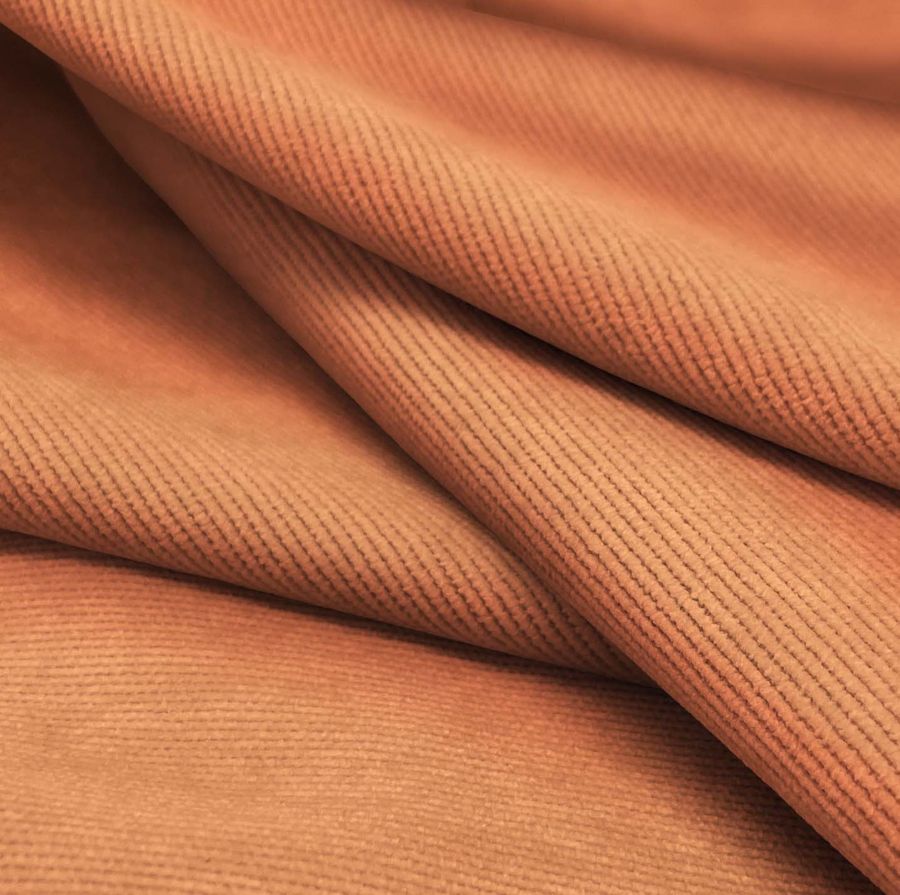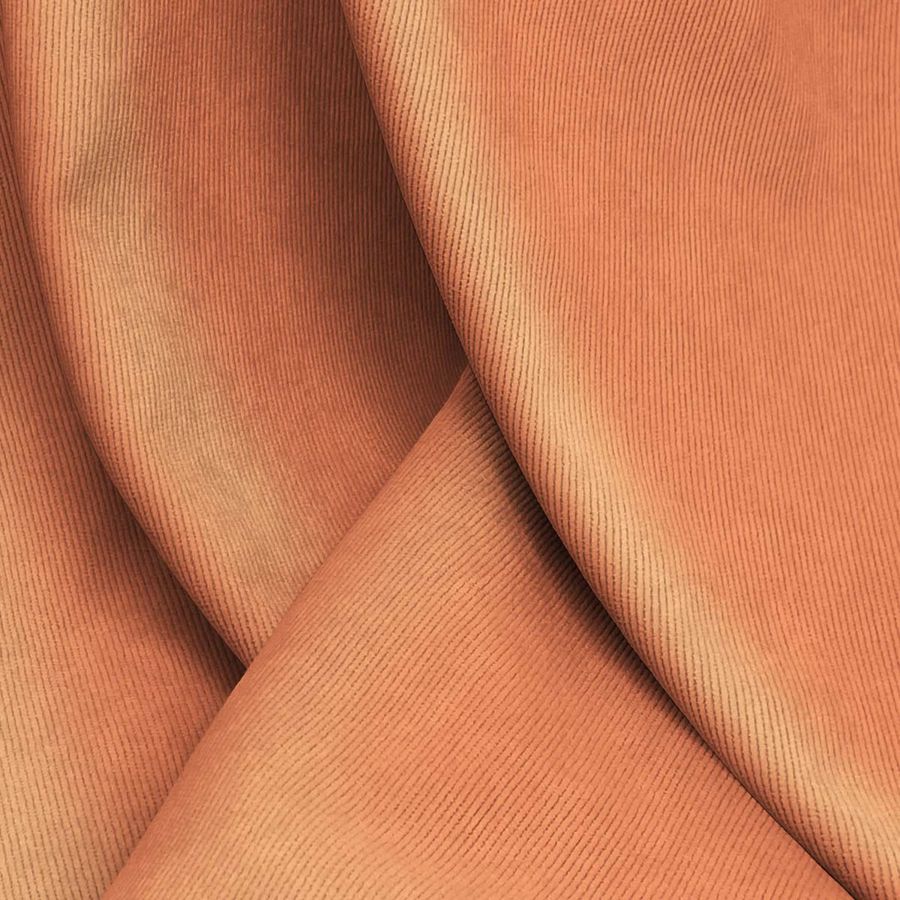 La tela base es la Pana Aterciopelada - Dublin, compuesta mayoritariamente por poliéster y poliamida con un toque de elastano, lo que le da una buena flexibilidad y resistencia a la tela. El color liso impreso es un hermoso naranja, inspirado en una puesta de sol, que se encuentra en la gama cromática de los colores cálidos. El CMYK de este color es 1 63 67 0, lo que indica fuertes tonalidades de magenta y amarillo. Este tono de naranja se combina perfectamente con colores cercanos, como tonos tierra y ocre, así como con marrones y negros, para dar un toque más sobrio y atenuado. La tela base está impresa en la cara delantera mediante un proceso de impresión digital textil.