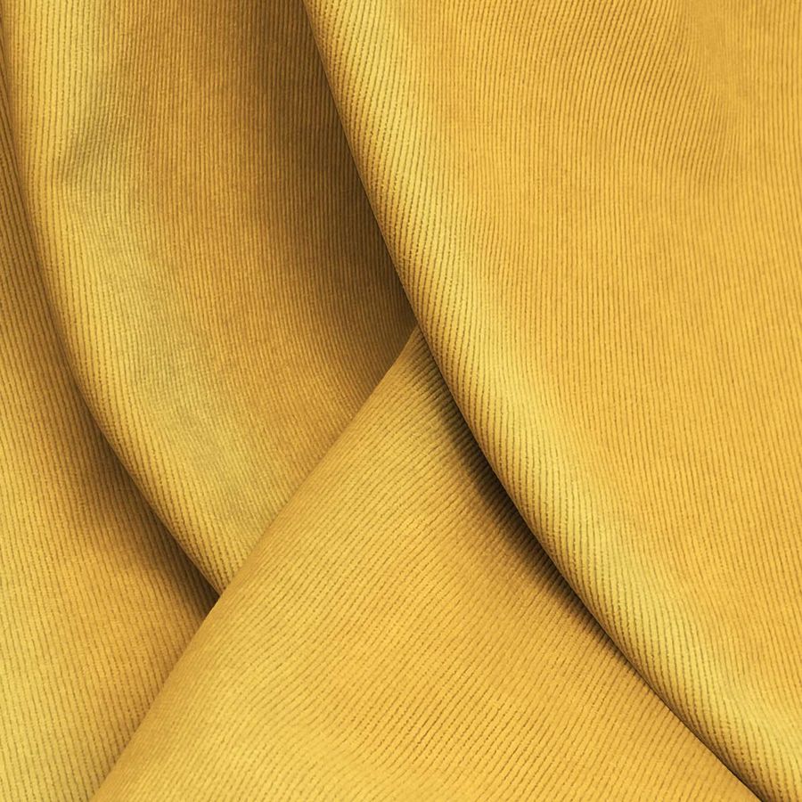 La tela base Pana Aterciopelada - Dublin destaca por su composición de 85% poliéster, 12% poliamida y 3% elastano, ofreciendo una textura suave al tacto y un brillo visual que resalta su color predominante, en amarillo y anaranjado con un CMYK de 0 38 78 0. Este color secundario se caracteriza por ser cálido y energético, y combina perfectamente con otras tonalidades tierra, especialmente marrones y verdes oscuros.