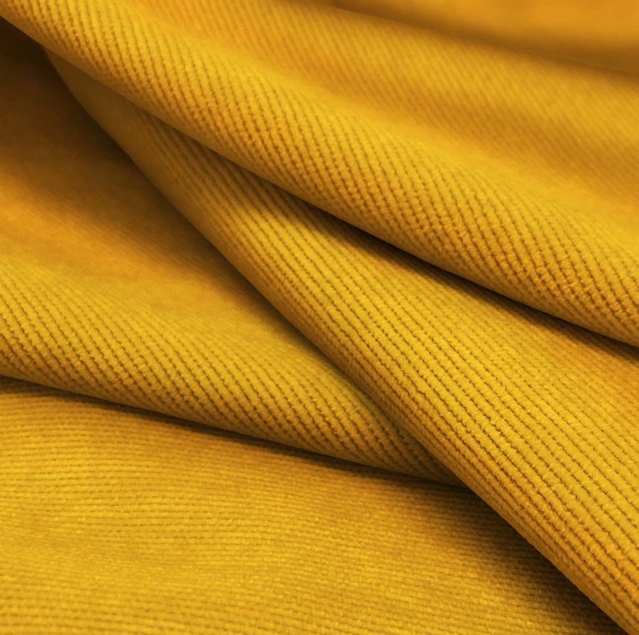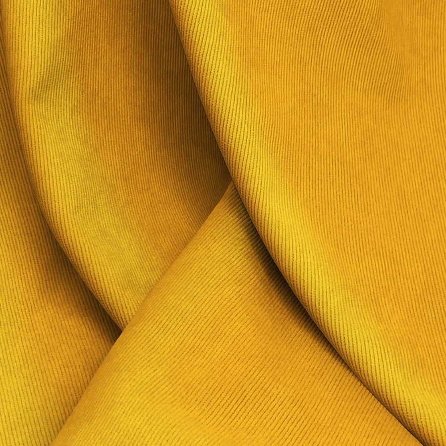 La tela base es una Pana Aterciopelada - Dublin, con composición de 85% poliéster, 12% poliamida y 3% elastano, con un peso de 280 gr/m2 y un ancho de 150 cm. Su color liso impreso es un tono amarillo caléndula con una combinación de tintas en CMYK de 0 49 93 0. Este color se caracteriza por transmitir alegría y energía, y combina especialmente bien con tonos tierra, verdes y azulados. Es importante destacar que el tejido está impreso con el color liso a una sola cara por impresión digital textil.