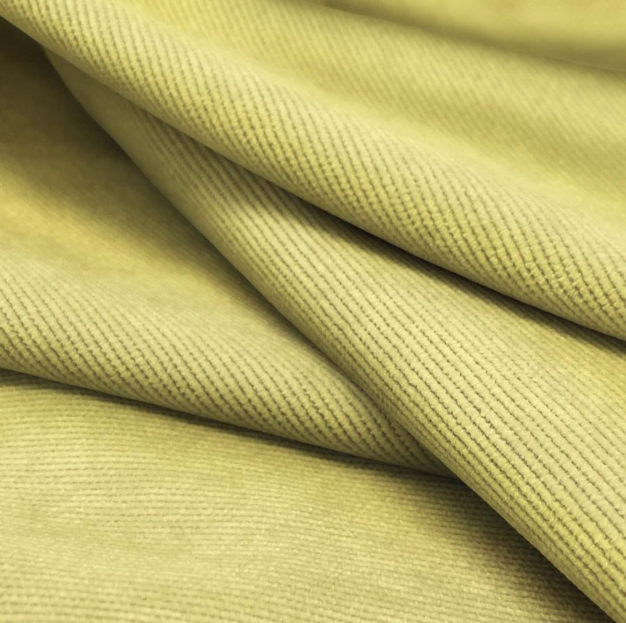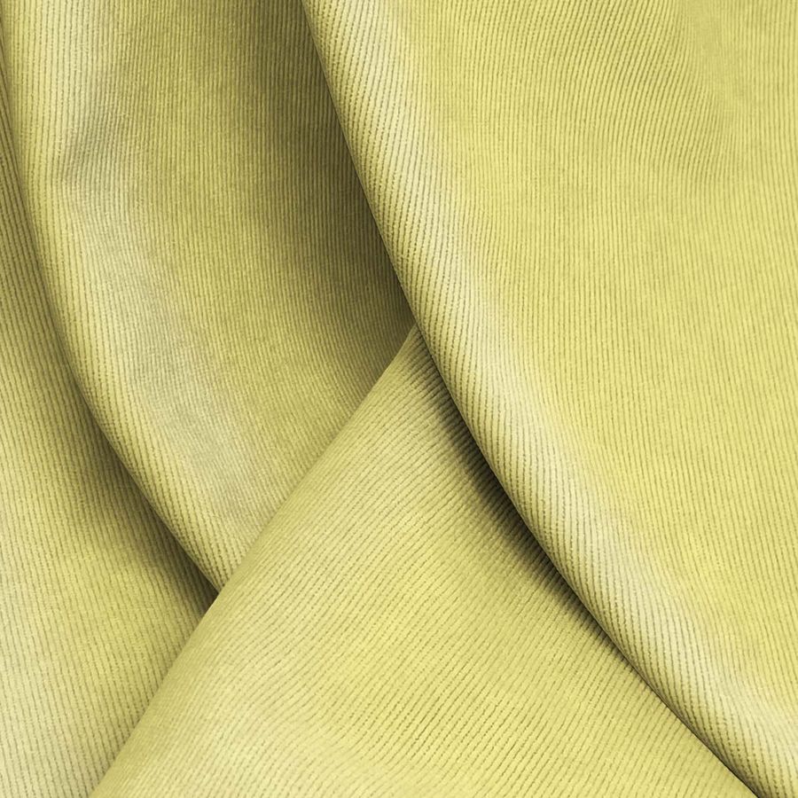 La tela base de esta descripción es la Pana Aterciopelada - Dublin, la cual está compuesta por un 85% de poliéster, un 12% de poliamida y un 3% de elastano. Su gramaje es de 280 gr/m2 y su ancho es de 150 cm. El color liso impreso es un vibrante amarillo canario con un CMYK de 10 8 64 0, que le da un aspecto suave y brillante. Este color combina muy bien con tonos verdes y naranjas.