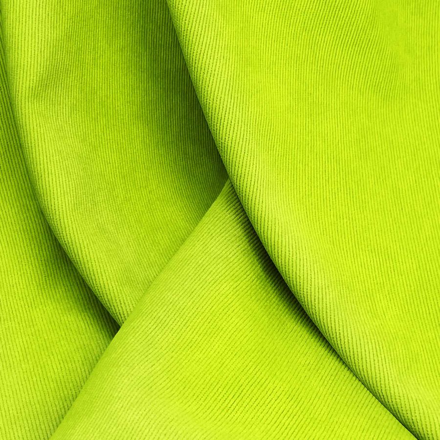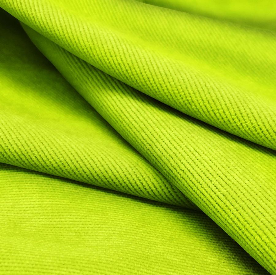 La tela base, Pana Aterciopelada - Dublin, está compuesta en un 85% de poliéster, 12% de poliamida y 3% de elastano, con un gramaje de 280 gr/m2 y una anchura de 150 cm. La tela tiene un tacto suave y brillante y su color liso impreso es verde pistacho, con una mezcla de tintas de 35% de cyan, 0% de magenta, 100% de amarillo y 0% de negro, reflejando un alto nivel de saturación y luminosidad. Este color secundario evoca frescura, vitalidad y naturaleza y es capaz de combinar perfectamente con colores análogos como el amarillo pálido y el verde lima, así como con colores complementarios como el rosa y el morado.