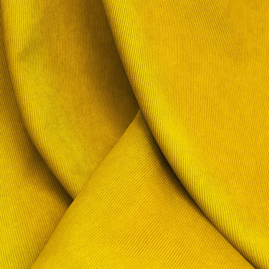 La tela base es una lujosa Pana Aterciopelada de composición 85% poliéster, 12% poliamida y 3% elastano. Su gramaje de 280 gr/m2 y su ancho de 150 cm aseguran una buena resistencia y manejabilidad. El color liso impreso en esta tela es un cálido Amarillo Melón con un CMYK de 2 38 96 0, que combina bien con tonos terrosos, beige y marrón. El tejido está impreso con el color liso a una sola cara por impresión digital textil.
