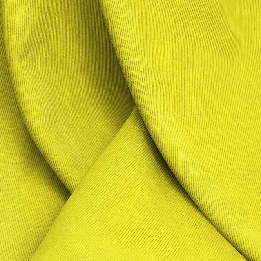 La tela base es Pana Aterciopelada-Dublin, compuesta por 85% de poliéster, 12% de poliamida y 3% de elastano, con un gramaje de 280 gr/m2 y un ancho de 150 cm. El color liso impreso es Amarillo Neón, con un CMYK de 7 0 85 0. Este color radiante y vibrante se asocia con la energía, la creatividad y la felicidad, y combina bien con tonos verdes, cian y azules.