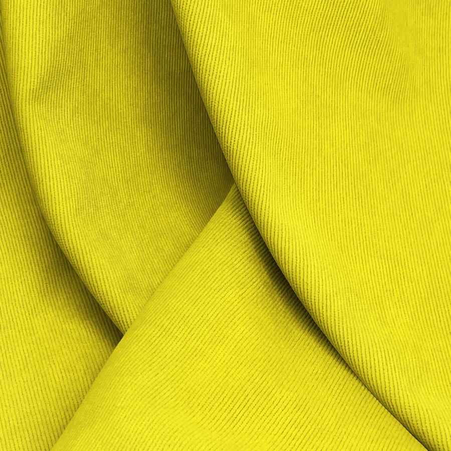 La tela base de este tejido es la Pana Aterciopelada - Dublin, compuesta por un 85% de poliéster, un 12% de poliamida y un 3% de elastano. Su gramaje es de 280 gr/m2 y su ancho es de 150 cm. El color liso impreso es de un amarillo sólido con un CMYK de 3 2 88 0, lo que indica que tiene una alta intensidad en la tinta amarilla. Este color transmite alegría, optimismo y energía, perfecto para añadir un toque vibrante a cualquier proyecto decorativo o de moda. Complementa muy bien con tonos verdes y morados, así como con colores neutros como el blanco, negro y gris.