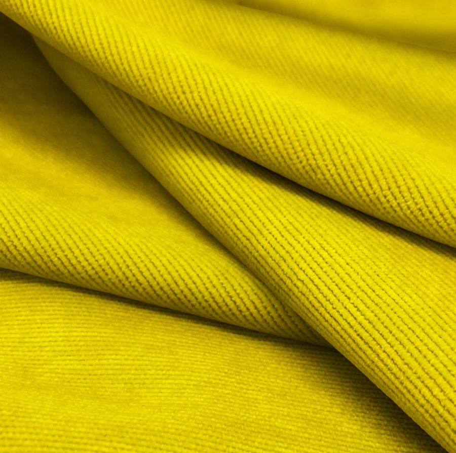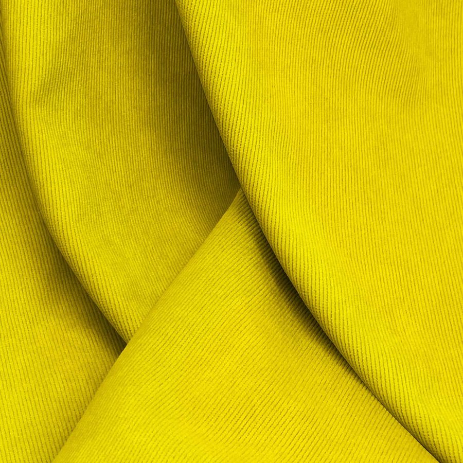La tela base de esta impresión es la Pana Aterciopelada - Dublin, con una composición de 85% poliéster, 12% poliamida y 3% elastano, lo que le da una textura suave y visualmente brillante. El color liso impreso es un vibrante amarillo tráfico, con una mezcla de 3% de tinta Cyan, 16% de tinta Magenta, 94% de tinta Yellow y 0% de tinta Black en su CMYK.