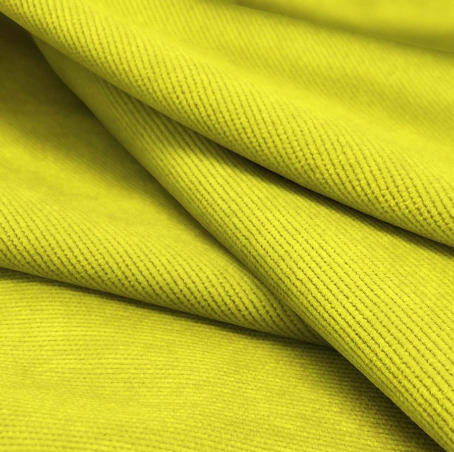 La tela base es la Pana Aterciopelada - Dublin, compuesta por un 85% de poliéster, un 12% de poliamida y un 3% de elastano. Su gramaje es de 280 gr/m2 y cuenta con un ancho de 150 cm. El color liso impreso es Amarillo de Zinc, que se obtiene a través de una combinación de tinta cyan, tinta magenta, tinta yellow y tinta black, con un CMYK de 10 0 84 0. Este color es suave y brillante, y combina especialmente bien con tonos neutros como el blanco o el gris.