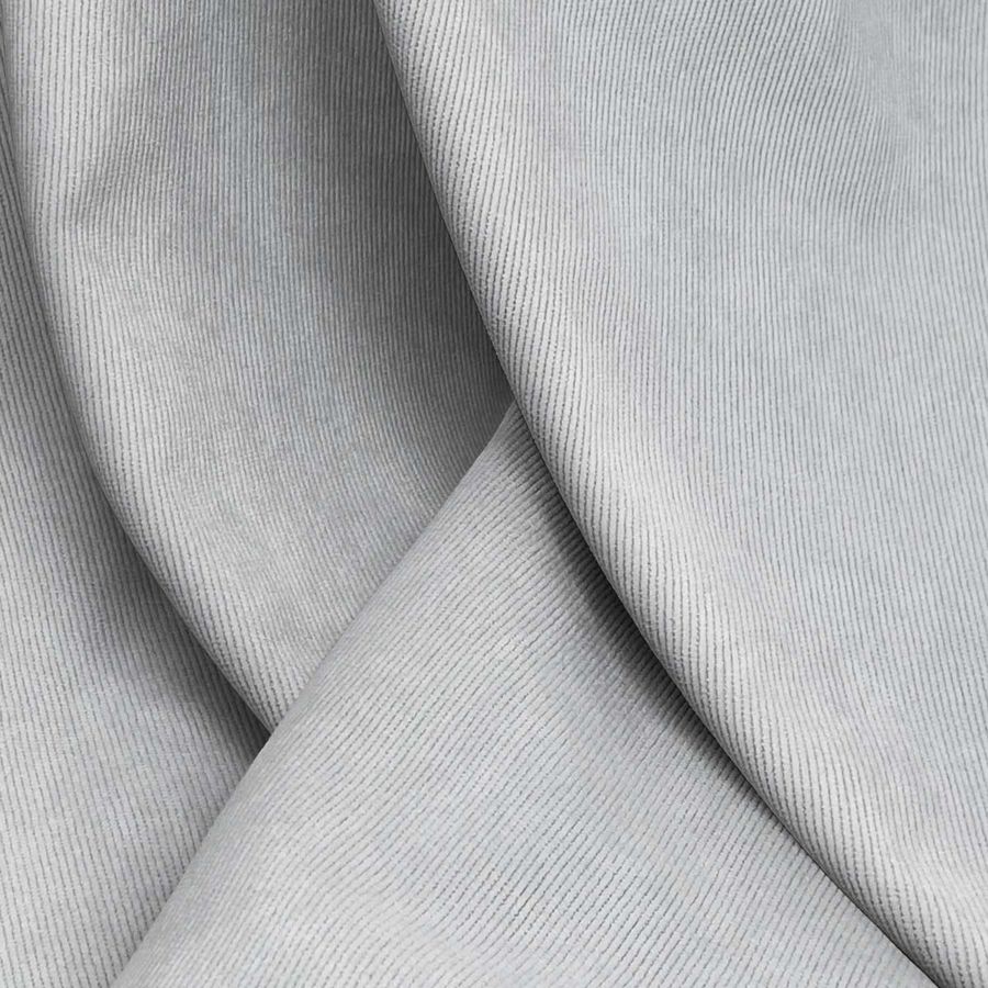 La tela base es la Pana Aterciopelada - Dublin, compuesta por un 85% de poliéster, un 12% de poliamida y un 3% de elastano, con un gramaje de 280 gr/m2 y una anchura de 150cm. El color liso impreso es un gris arena de plata, que se compone de 29% de tinta cyan, 20% de tinta magenta, 21% de tinta amarilla y un 2% de tinta negra, según el CMYK. Simbólicamente, este color representa la elegancia y el estilo sofisticado. Su textura visual es brillante y su tacto resulta suave al contacto. El color secundario combina a la perfección con tonos negros, dorados o plateados y con otras gamas de grises. Es importante destacar que la tela está impresa con el color liso a una sola cara por impresión digital textil, lo que significa que no se trata de un tejido tintado sino impreso mediante una sola cara.