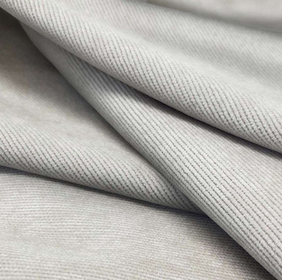 La tela base de esta pieza es la pana aterciopelada Dublín, compuesta de poliéster, poliamida y elastano. El color impreso en esta tela es gris en una tonalidad llevada hacia el color Gainsboro, obtenida por una combinación de tintas cian, magenta y amarillo en diferentes grados junto a la nula presencia de tinta negra en la impresión.