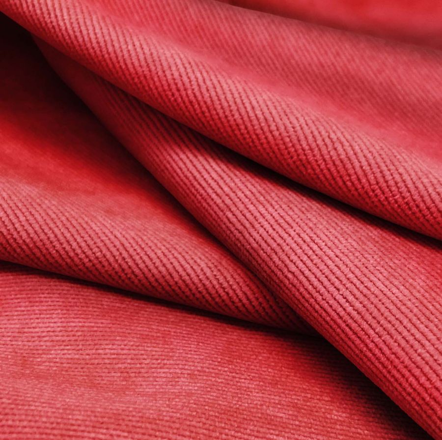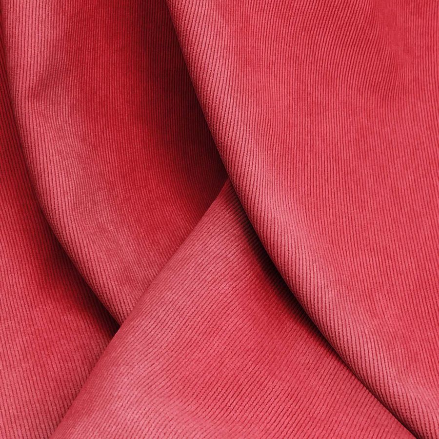 La tela base, Pana Aterciopelada - Dublin, cuenta con una composición de 85% poliéster, 12% poliamida y un 3% de elastano, lo que la hace resistente y duradera. El color liso impreso es de un rojo cartamina, representado por un CMYK de 10, 91, 71, 2. Este color tiene una gran carga energética y vitalidad, remitiendo al amor y la pasión. Es un color secundario que se combina muy bien con tonos violetas y rosados, así como con tonos fríos como el azul, marino o turquesa.