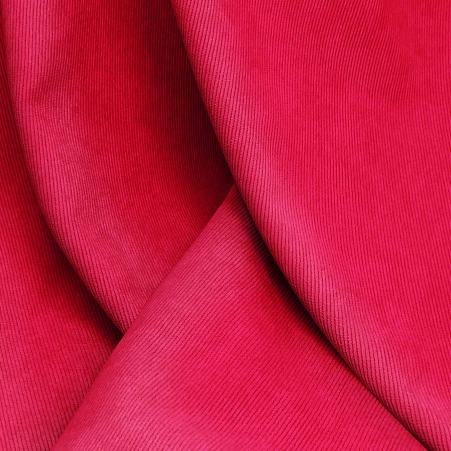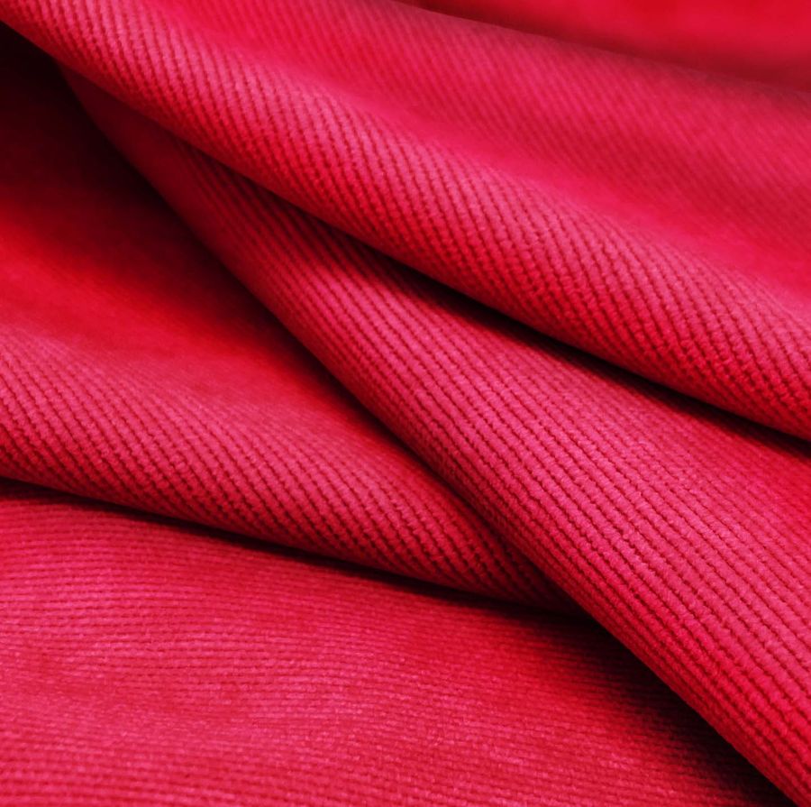 La tela base de esta descripción es la Pana Aterciopelada - Dublin, compuesta por un 85% de poliéster, un 12% de poliamida y un 3% de elastano, con un gramaje de 280 gr/m2 y un ancho de tela de 150cm. El color liso impreso es un rojo escarlata con una tinta Cyan de 1, una tinta Magenta de 100, una tinta Yellow de 76 y una tinta Black de 0, representando un CMYK de 1 100 76 0.