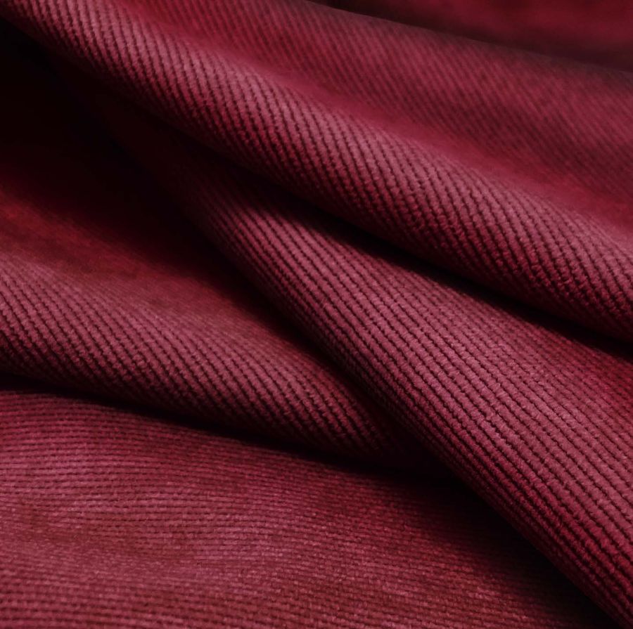 La tela base de este tejido es la Pana Aterciopelada - Dublin, compuesta principalmente de 85% POLIÉSTER, 12% POLIAMIDA y 3% ELASTANO, con un gramaje de 280 gr/m2 y un ancho de 150 cm. Es un tejido suave al tacto y visualmente brillante. El color liso impreso en esta tela tiene un tono Rojo Escarlata Oscuro, cuyo contenido en CMYK es de 40 100 65 64. Este color secundario es intenso y profundo, inspirando sensaciones de pasión y fuerza. Combina bien con tonos claros como el crema, beige y gris, así como con tonos más oscuros como el marrón oscuro y el negro.