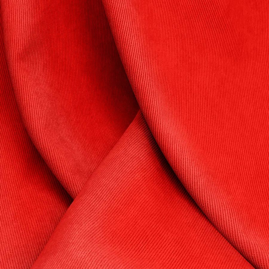 La tela base es la Pana Aterciopelada - Dublin, compuesta por 85% POLIÉSTER, 12% POLIAMIDA y 3% ELASTANO, con un gramaje de 280 gr/m2 y ancho de 150 cm. La impresión del color liso se realiza mediante tecnología de sublimación, que otorga al color un aspecto brillante y luminoso. El color impreso es una combinación de Rojo y Caramelo, con CMYK 0 94 92 0, lo que le da un aspecto cálido y llamativo. Es un color que combina muy bien con tonalidades amarillas y naranjas.