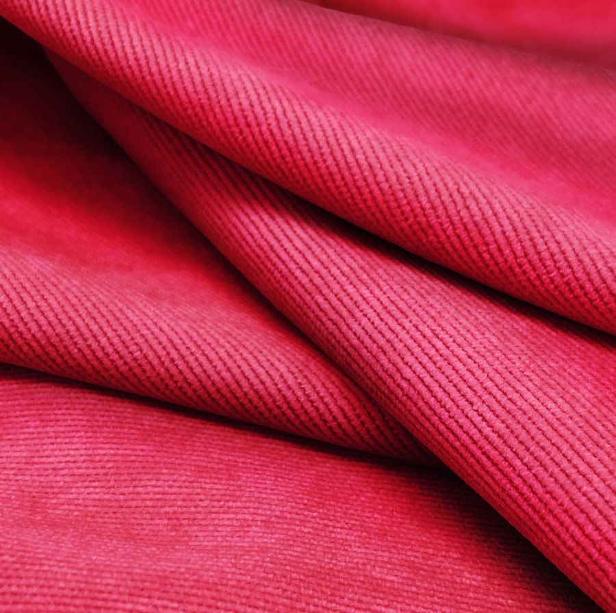 La tela base es una elegante Pana Aterciopelada, llamada Dublin, compuesta por un 85% de POLIÉSTER, un 12% de POLIAMIDA y un 3% de ELASTANO. El tono impreso es Rojo Crayola, con un CMYK de 0 94 56 0, lo que le proporciona un perfil magenta y amarillo llamativo y brillante. Complementa muy bien con tonos verdes oscuros y azules marinos. Cabe destacar que el tejido está impreso a una sola cara mediante impresión digital textil.