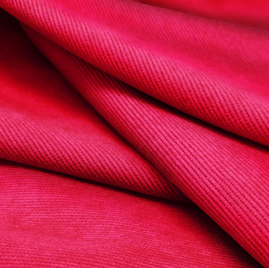 La tela base es la Pana Aterciopelada - Dublin, compuesta por un 85% de poliéster, un 12% de poliamida y un 3% de elastano, con un gramaje de 280 gr/m2 y un ancho de 150 cm. El color liso impreso es rojo munsell, con un CMYK de 0 97 66 0. Este color se caracteriza por su intensidad y viveza, mezclando magenta y amarillo en proporciones casi iguales, a la vez que se mantiene oscuro gracias a la ausencia de tinta cian. Combinado con diferentes tonos neutros como el gris o el blanco, este color se convierte en el protagonista indiscutible del ambiente.