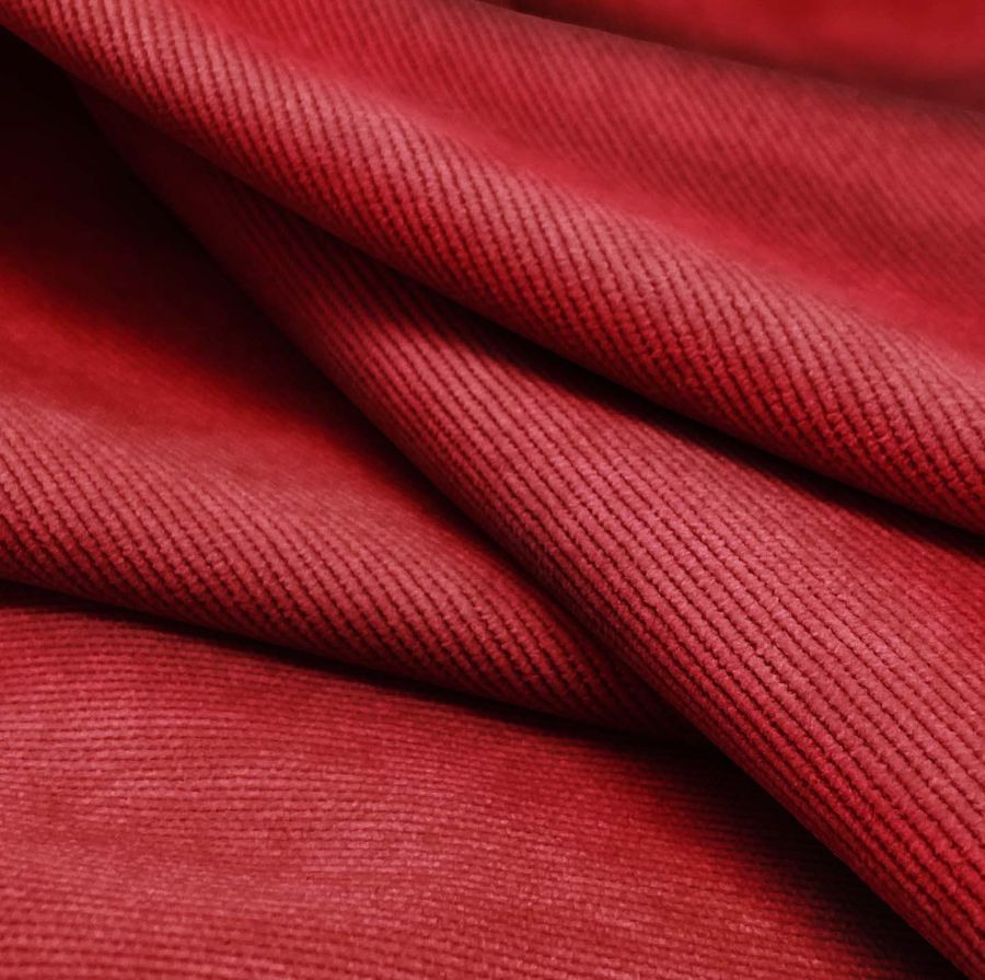 La tela base de este tejido es la Pana Aterciopelada - Dublin, compuesta por 85% POLIÉSTER, 12% POLIAMIDA y 3% ELASTANO, con un gramaje de 280 gr/m2 y un ancho de 150 cm. Este tejido tiene un color liso impreso en rojo rubí, con una combinación de tinta CYMK de 25, 100, 89 y 24, respectivamente.