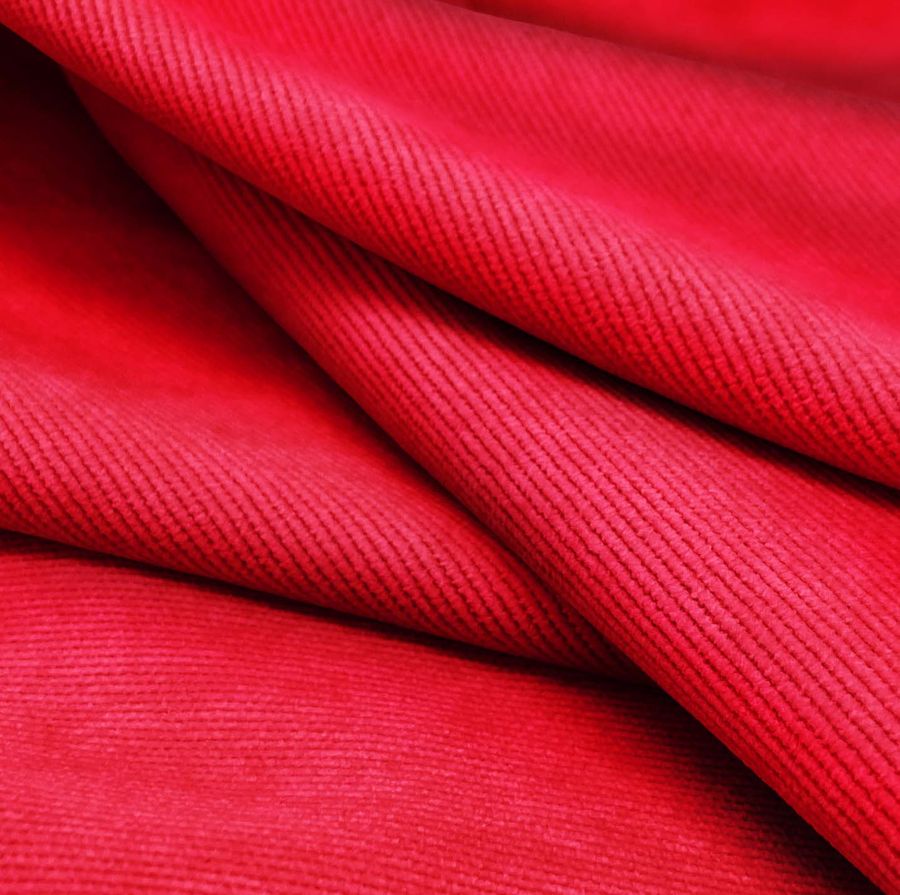 La tela base de este tejido es Pana Aterciopelada - Dublin en un tono liso impreso de color Rubicundo, con una combinación de tinta Cyan: 0, Magenta: 95, Yellow: 76 y Black: 0, dando como resultado un perfil de color CMYK de 0 95 76 0. El color secundario Rubicundo ofrece un tono intenso y vibrante que se asocia con la energía y el poder, y combina perfectamente con tonos complementarios como el verde oliva, el dorado y el caqui.