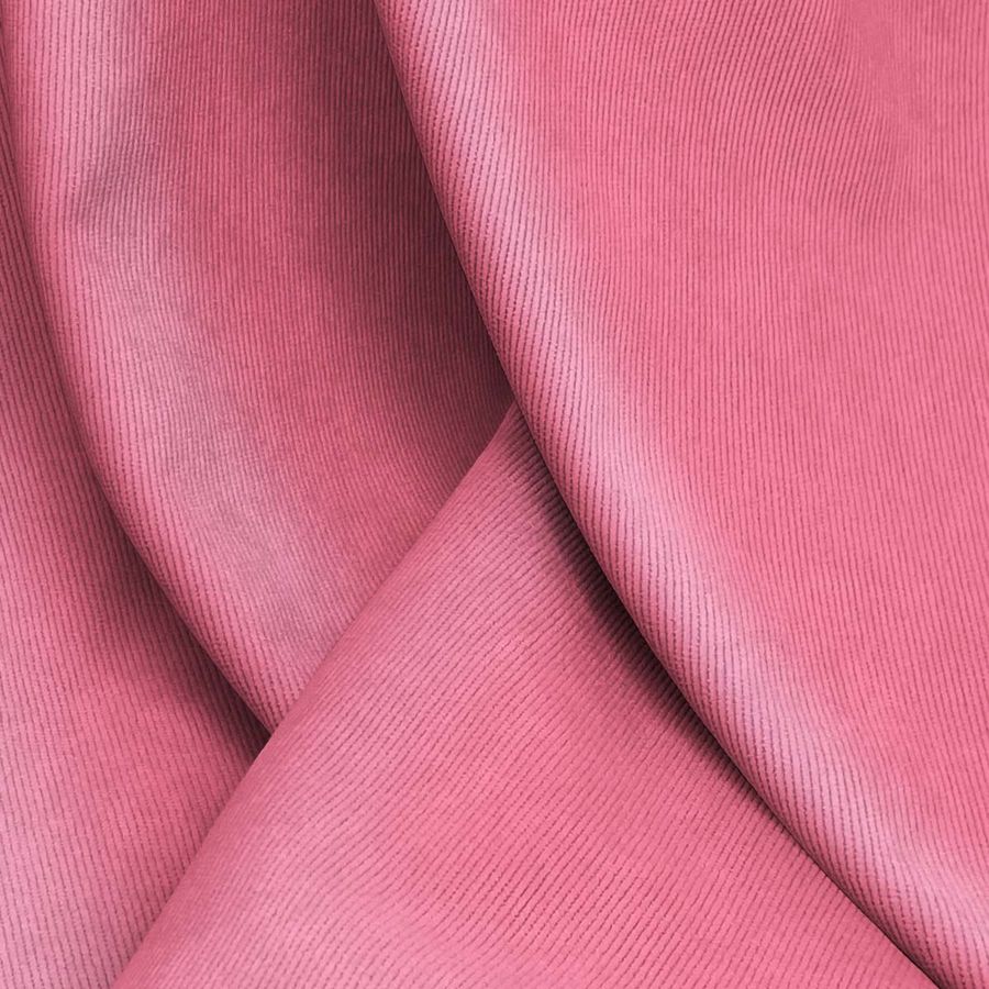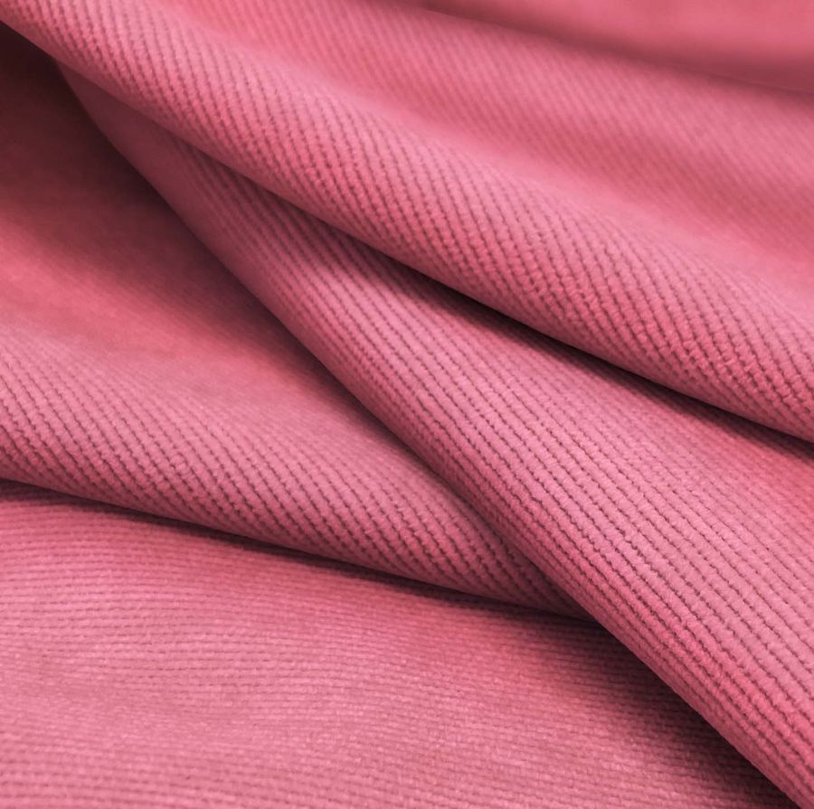 La tela base de esta prenda es la Pana Aterciopelada - Dublin, un tejido de tipo pana compuesto por un 85% de poliéster, un 12% de poliamida y un 3% de elastano con un gramaje de 280 gr/m2 y un ancho de 150 cm. El color liso impreso es un rojo sandía con valores CMYK de 0 70 29 0, lo que refleja una fuerte presencia de los colores magenta y amarillo en la mezcla. Esta combinación genera un color llamativo, intenso y cálido que combina perfectamente con tonos como el negro, marrón oscuro, gris y dorado.