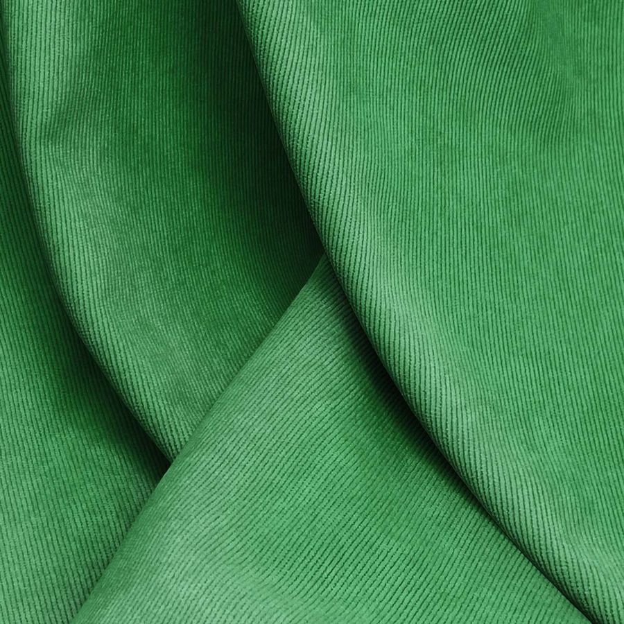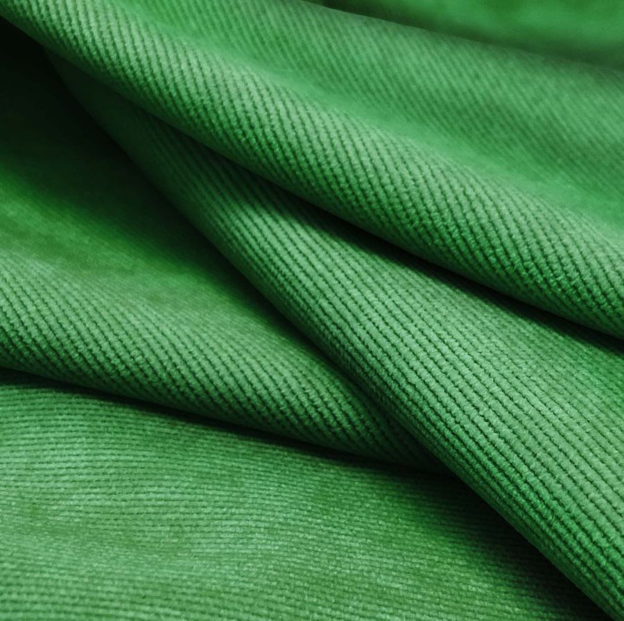 La tela base de este tejido es una Pana Aterciopelada - Dublin compuesta por 85% de poliéster, 12% de poliamida y 3% de elastano. El color liso impreso es un verde alga con un CMYK de 81 27 88 12, que se combina muy bien con tonalidades marrones y grises para crear un ambiente cálido y natural. La tela está impresa con un color liso a una sola cara por impresión digital textil.