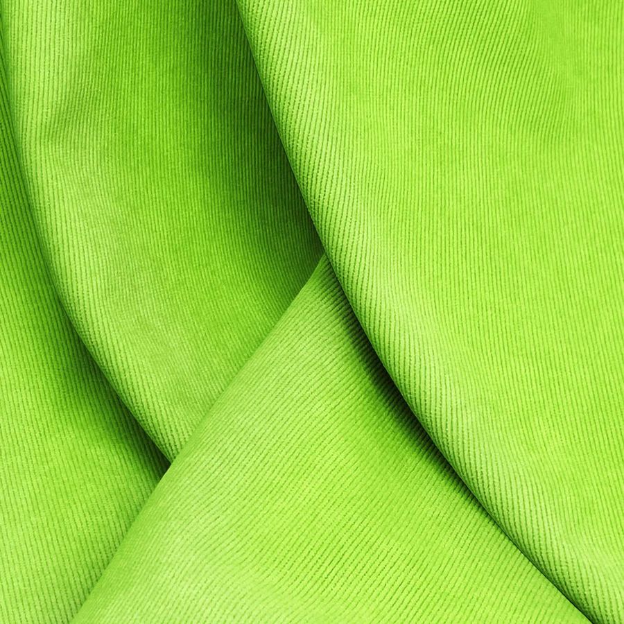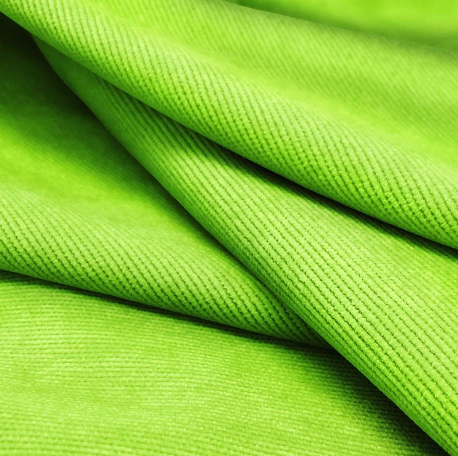 La tela base, Pana Aterciopelada - Dublin, con su composición de 85% poliéster, 12% poliamida y 3% elastano, tiene un gramaje de 280 gr/m2 y un ancho de 150 cm. Es una tela suave al tacto y brillante a la vista, ideal para la decoración y la moda de invierno. El color liso impreso es un verde lima con un CMYK de 46 0 100 0. Este color representa la frescura y la vitalidad, combinando muy bien con grises y marrones para una paleta cálida y con blanco y negro para una paleta más contrastada. Es importante mencionar que la tela está impresa con el color liso a una sola cara por impresión digital textil, lo que significa que solo una de las caras del tejido lleva el estampado.
