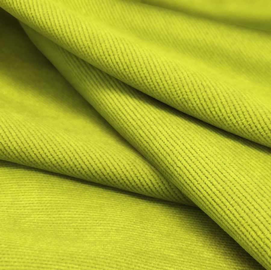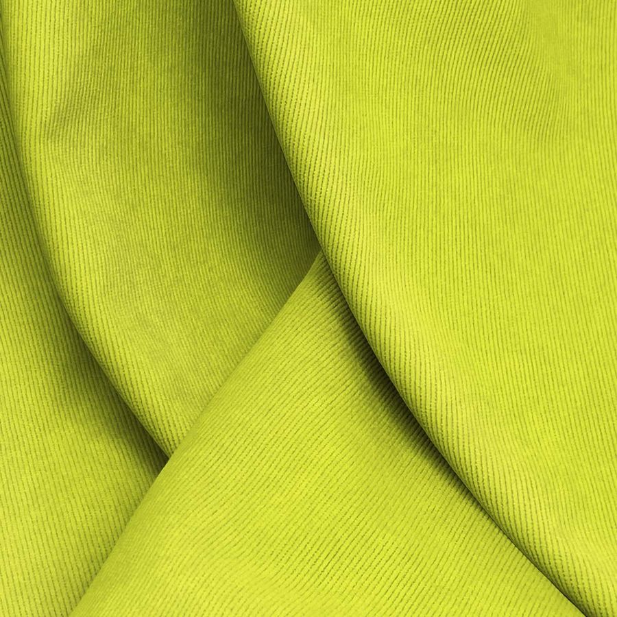 La tela base es la Pana Aterciopelada - Dublin, compuesta principalmente de poliéster, poliamida y elastano, con un gramaje de 280 gr/m2 y un ancho de 150 cm. El color impreso es Verde Pera, reflejado en el CMYK 27 0 85 0. Este color se asemeja a una pera madura, con una tonalidad verde brillante y sutilmente amarillenta. Este color combina a la perfección con tonos tierra y marrones.