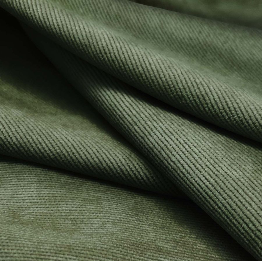 La tela base Pana Aterciopelada - Dublin impresa en un color liso Blanco Apagado con un CMYK de 68, 47, 70 y 49. El color secundario, Tortuga Verde, se describe como un verde oscuro y terroso con un toque suave y relajante. Combina bien con tonos marrones, beige y mostaza. Es importante destacar que la impresión se realiza a una sola cara por impresión digital textil y no es un tejido tintado.