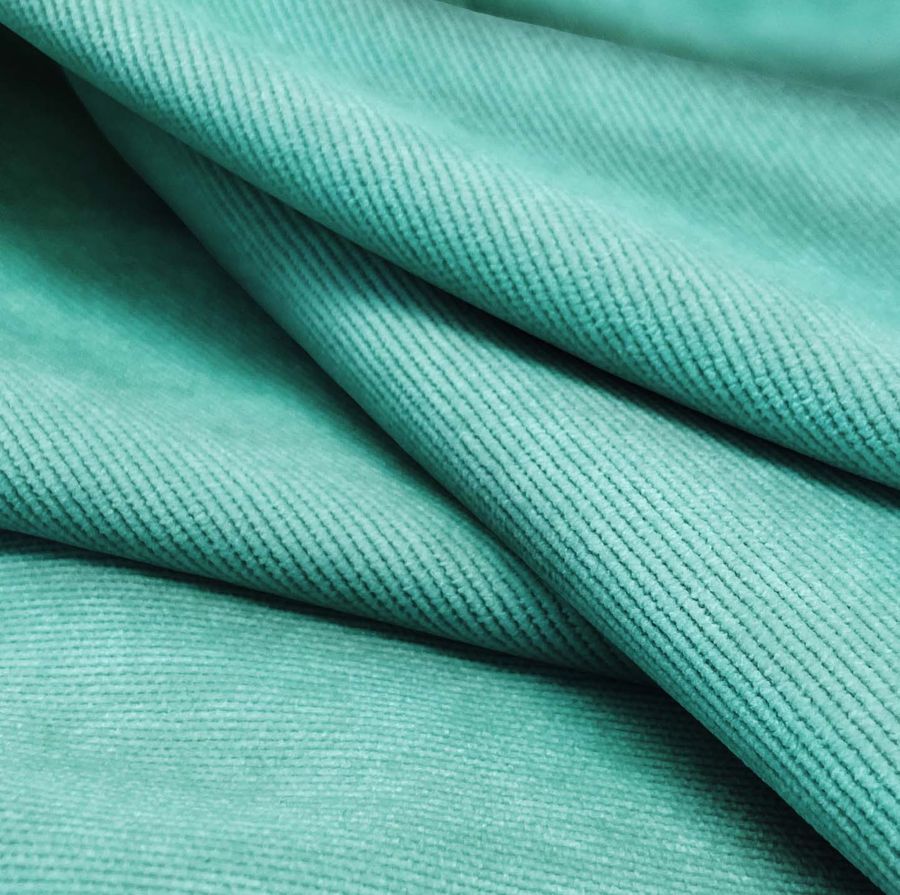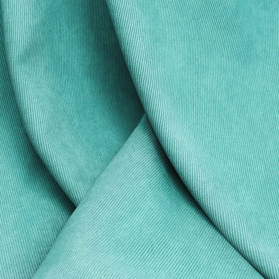La tela base es Pana Aterciopelada Dublin, con 85% POLIÉSTER, 12% POLIAMIDA y 3% ELASTANO. El color liso impreso es un vibrante Verde-Turquesa con CMYK de 62 0 33 0. Este color secundario simboliza la serenidad del agua y la energía de la naturaleza combinando el verde de la naturaleza y el turquesa del mar. Se combina especialmente con colores neutros como beige, marrón y gris para absorber su intensidad y con colores ocres, cobre y naranjas para aportar calidez. La tela está impresa con el color verde-turquesa a una sola cara por impresión digital textil. La tela base es suave al tacto y visualmente brillante, con una textura que aporta profundidad al color liso.