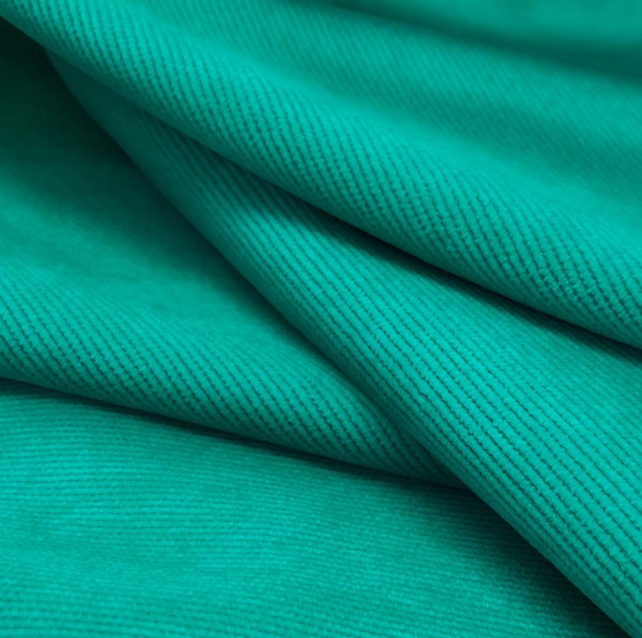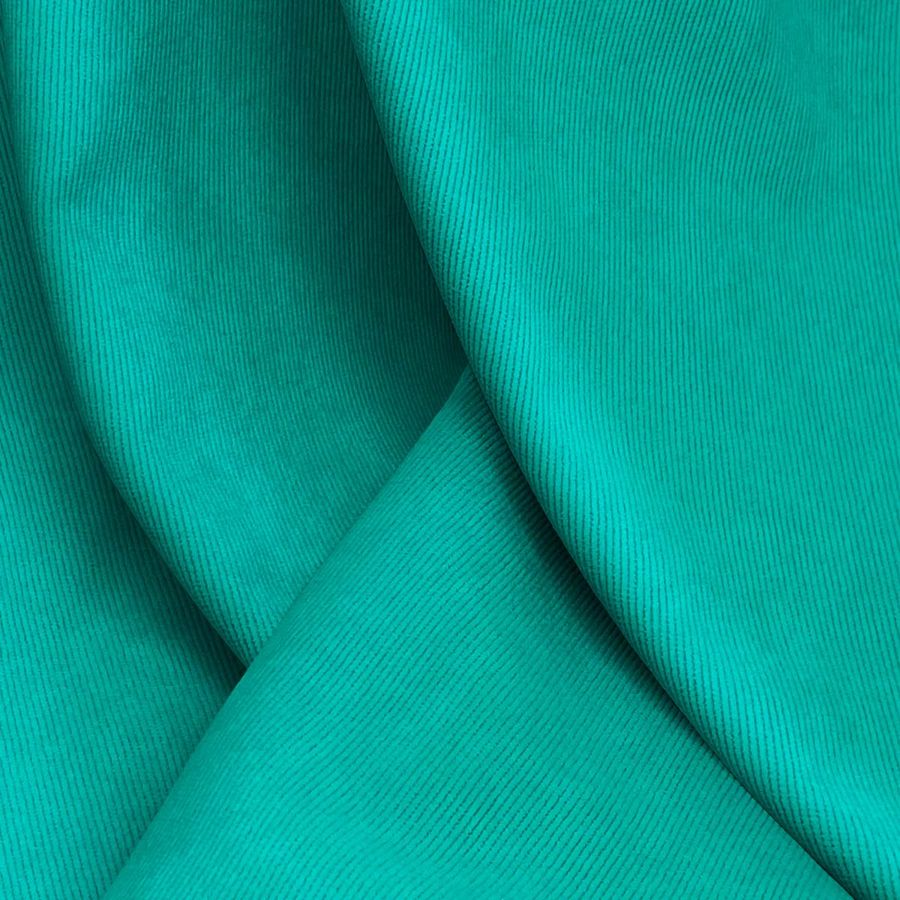La tela base de esta descripción es la Pana Aterciopelada - Dublin, compuesta por 85% POLIÉSTER, 12% POLIAMIDA y 3% ELASTANO, con un gramaje de 280 gr/m2, ancho de 150 cm y diversos usos como tapicería, decoración y moda, entre otros. El color liso impreso de la tela es un verde azulado medio, con un contenido de CMYK de 80 13 52 1. Este color combina especialmente bien con tonos beige, amarillos y dorados. Es importante señalar que la tela está impresa a una sola cara por impresión digital textil.