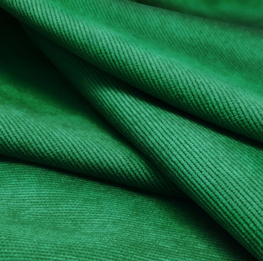 La tela base es la Pana Aterciopelada - Dublin, con una composición de 85% poliéster, 12% poliamida y 3% elastano, con un gramaje de 280 gr/m2 y un ancho de 150 cm. El color liso impreso es Verde Cadmio con un CMYK de 89 31 90 23, logrado por sublimación (poliéster). Este color ofrece una tonalidad que inspira naturaleza, tranquilidad y armonía. Simboliza la esperanza y se asocia con la primavera, un renacer en la vida. Se combina especialmente bien con otros colores verdes, amarillos, marrones y grises.