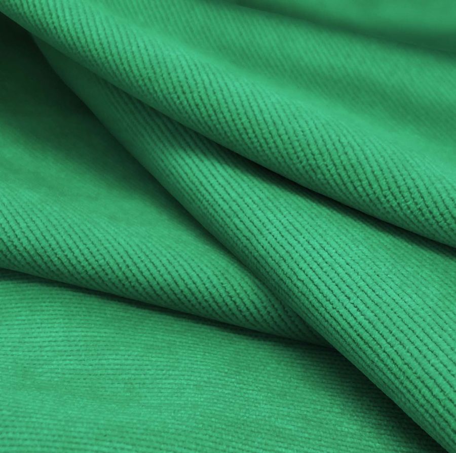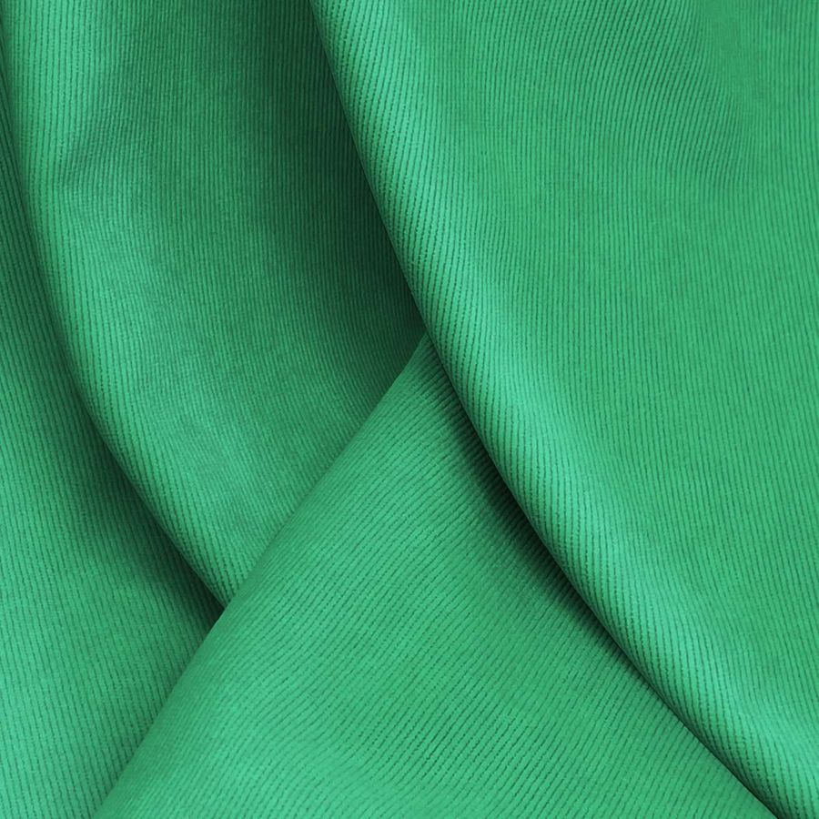 La tela base de esta prenda es la Pana Aterciopelada - Dublin, compuesta por un 85% de poliéster, un 12% de poliamida y un 3% de elastano, con un gramaje de 280 gr/m2 y un ancho de 150 cm. El color liso impreso es un intenso verde kelly, con CMYK 77 12 73 1, que se aplica por un único lado mediante impresión digital textil. El color verde kelly es un tono vivo, luminoso y energético, que nos evoca a la naturaleza y a la renovación, pero también a la tecnología y a la modernidad. Este color combina especialmente bien con otros tonos verdes, pero también con tonos marinos, dorados y marrones.
