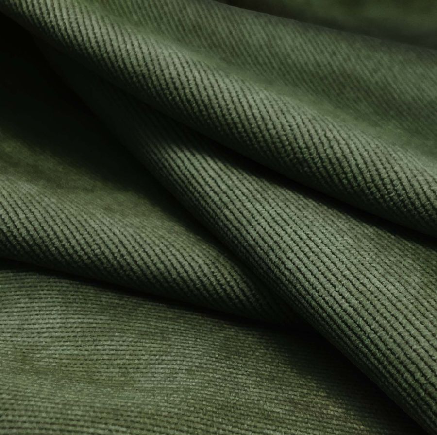 La tela base de este tejido es la Pana Aterciopelada - Dublin, compuesta por un 85% de poliéster, 12% de poliamida y un 3% de elastano, con un gramaje de 280 gr/m2 y un ancho de 150 cm. El color liso impreso en uno de sus lados es un Verde Monte, cuyo CMYK es 75 53 80 64. Este tono es una combinación de verde musgo con matices pardos y grises, evocando la naturaleza y la tranquilidad. Además, se combina especialmente bien con tonos marrones y tierras.