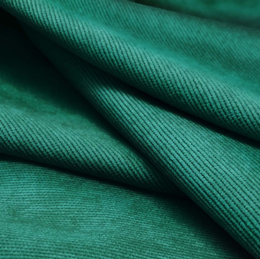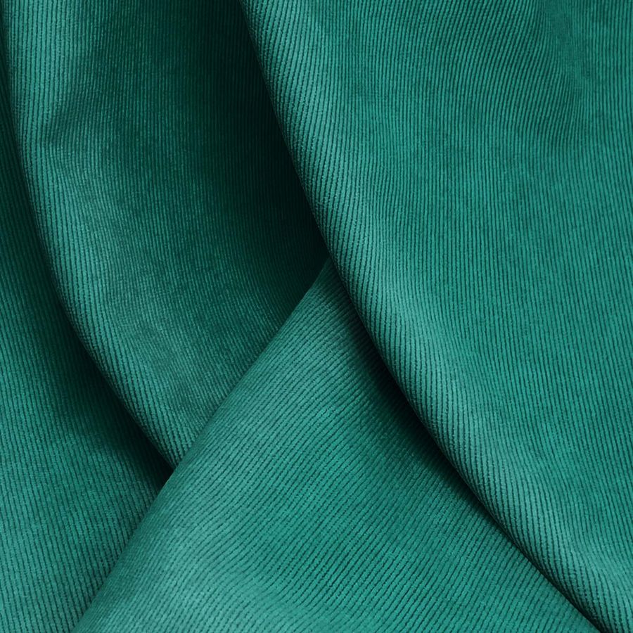La tela base de este tejido es una Pana Aterciopelada - Dublin compuesta por un 85% de poliéster, un 12% de poliamida y un 3% de elastano con un gramaje de 280 gr/m2 y un ancho de 150 cm. El color liso impreso es Ópalo Verde con un CMYK de 89 36 63 34, que se caracteriza por su brillo y suavidad. Este color secundario combina a la perfección con tonos beige y marrones.