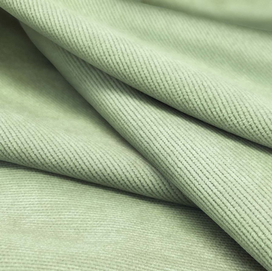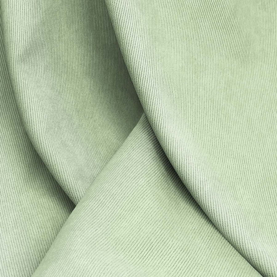 La tela base es la Pana Aterciopelada - Dublin, compuesta por un 85% de poliéster, un 12% de poliamida y un 3% de elastano, con un gramaje de 280 gr/m2 y un ancho de 150 cm. El color liso impreso es un verdoso pastel, que se consigue por medio de una impresión digital textil utilizando las tintas cian y amarillo, en un porcentaje del 28% y 40%, respectivamente. Las características de la tela base son su suave textura y su brillo visual, mientras que el color liso impreso tiene un acabado mate, creando un contraste con la textura de la pana. Este verde pastel se combina a la perfección con otros tonos claros de verdes, así como con diferentes tonos de grises.