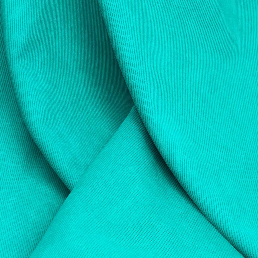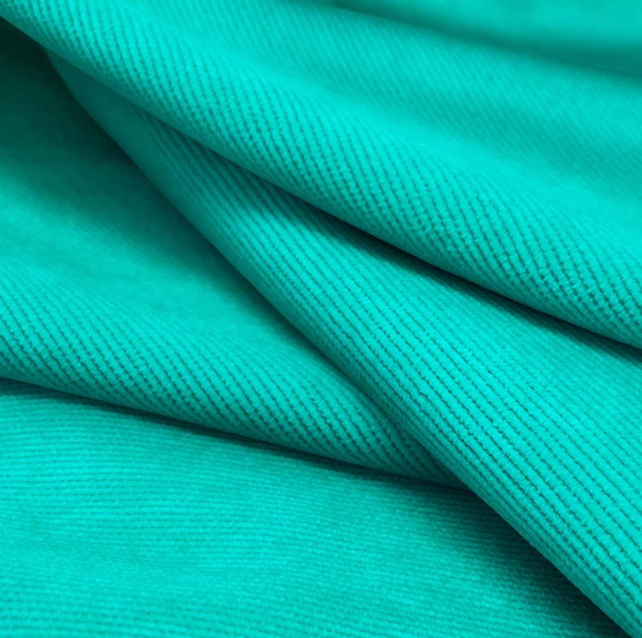 La tela base es la Pana Aterciopelada Dublin, compuesta por 85% de poliéster, 12% de poliamida y 3% de elastano. El color liso impreso es un verde espuma de mar con un contenido de CMYK de 65-0-31-0, lo que significa que contiene un alto porcentaje de cian y un porcentaje moderado de amarillo, lo que le da una tonalidad fresca y relajante. Este tono es ideal para complementar otros colores relacionados con la naturaleza y el mar, como el blanco roto, el gris claro y el turquesa.