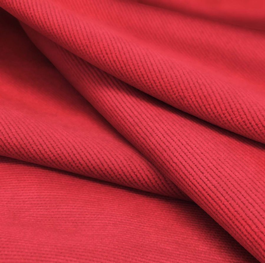La Pana Aterciopelada - Dublin es un tejido de pana compuesto por 85% poliéster, 12% poliamida y 3% elastano, con un gramaje de 280 gr/m2 y un ancho de 150 cm. El color liso impreso es un rojo Pantone, con una combinación de tinta cian de 0, magenta de 89, amarillo de 68 y negro de 0, resultando en un CMYK de 0 89 68 0. Este color secundario combina perfectamente con tonos dorados y verdes oliva. El tejido está impreso con el color liso a una sola cara por impresión digital textil, no es un tejido tintado sino impreso por una sola cara.