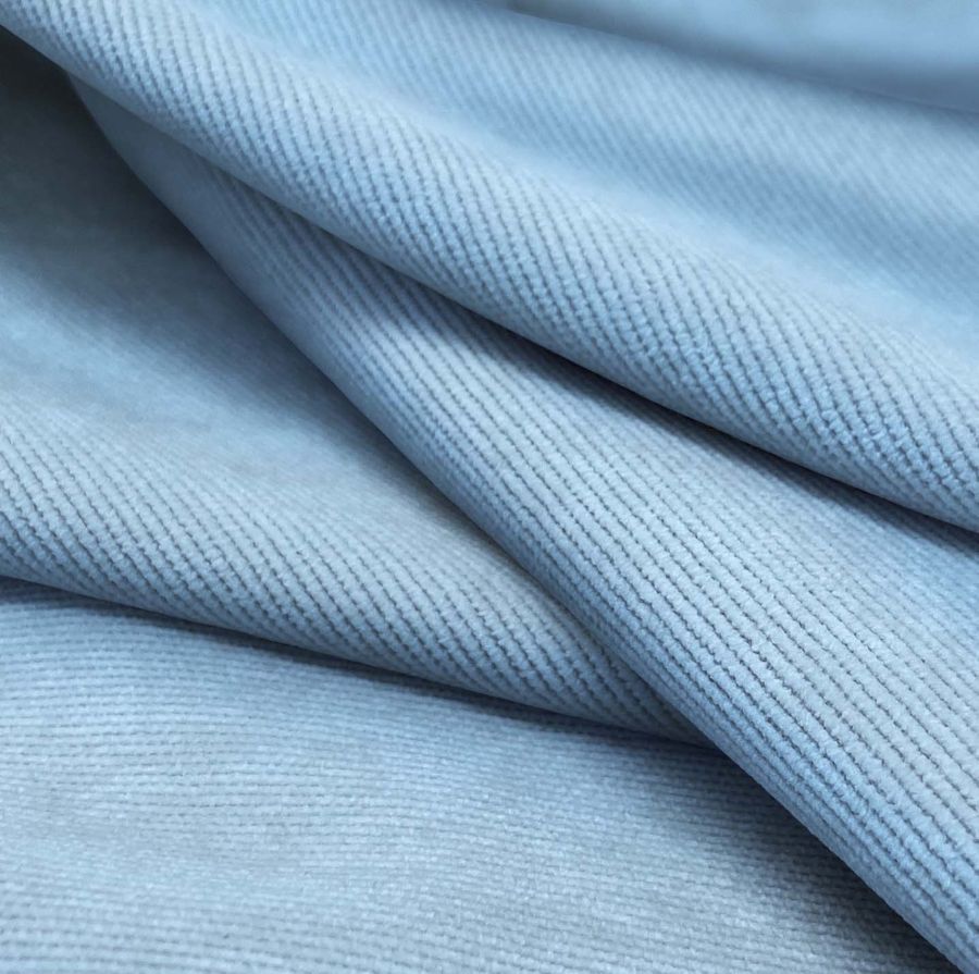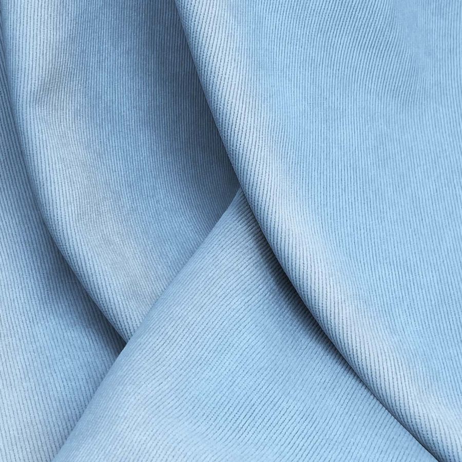 La Pana Aterciopelada - Dublin es un tejido de pana suave y elegante, compuesto por un 85% de poliéster, un 12% de poliamida y un 3% de elastano. El color liso impreso en la tela base es un tono azul cielo con un CMYK de 45 14 0 0, que genera una sensación de calma y tranquilidad. Este color azul cielo combina muy bien con otros tonos pastel, así como con colores más intensos como el gris o el marrón claro.