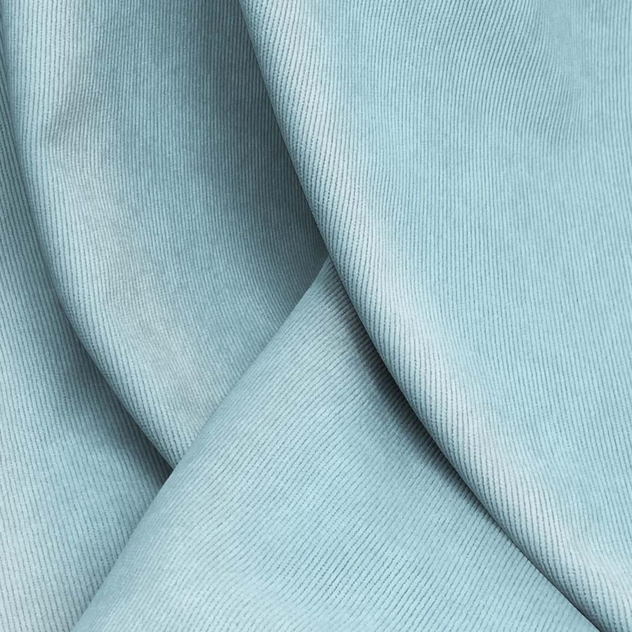 La tela base es la Pana Aterciopelada - Dublin y su color liso impreso es azul hielo, con un CMYK de 42 5 13 0. El color refleja la suavidad del tejido y su textura brillante. Las características generales de la tela son la combinación de poliéster, poliamida y elastano, lo que la hace resistente y elástica con un gramaje de 280 gr/m2 y un ancho de 150 cm. Con respecto a su uso, es ideal para decoración de interiores y exteriores, tapizados de sillas, sillones, sofás, cojines, cestas, entre otros.