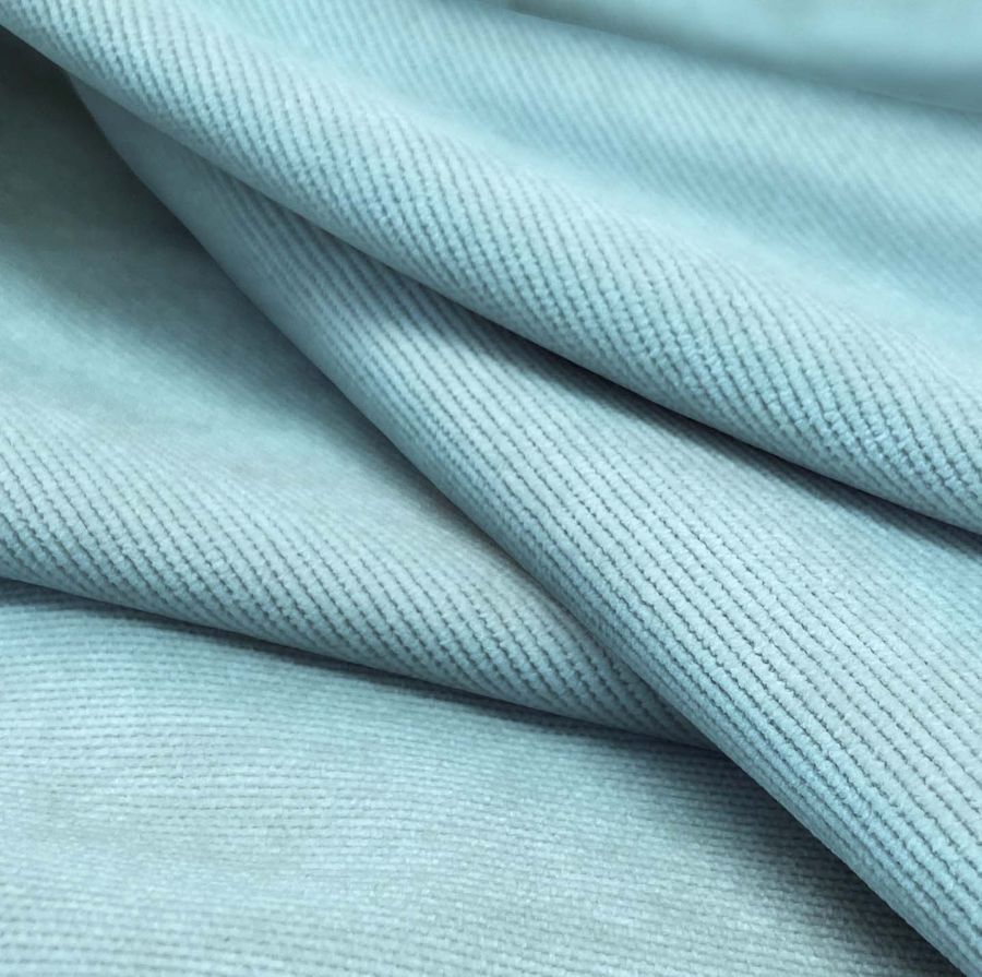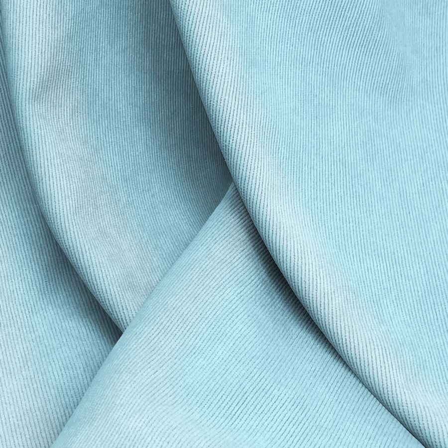 La tela base de este tejido es la Pana Aterciopelada - Dublin, compuesta por 85% de poliéster, 12% de poliamida y 3% de elastano, con un gramaje de 280 gr/m2 y un ancho de 150 cm. El color liso impreso en esta tela es Azul Pálido, con un contenido de tinta Cyan de 37, tinta Magenta de 0, tinta Yellow de 2 y tinta Black de 0, expresado mediante el código CMYK 37 0 2 0. Este color secundario simboliza la tranquilidad, serenidad y frescura del cielo azul en sus tonalidades más claras, y se combina muy bien con otros tonos pasteles como el rosa, el lila o el beige.