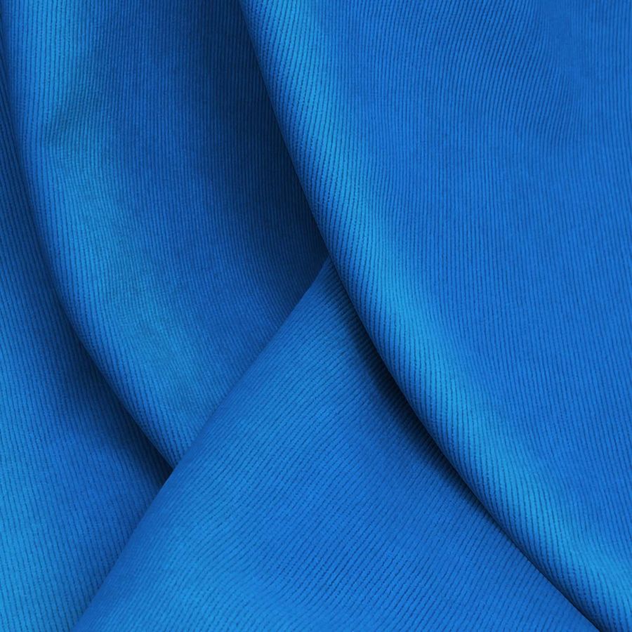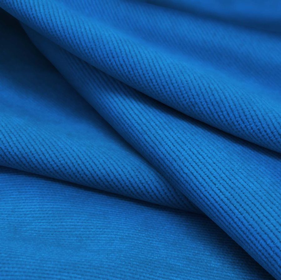 La tela base, Pana Aterciopelada - Dublin, presenta una composición de 85% POLIÉSTER, 12% POLIAMIDA, 3% ELASTANO, con un gramaje de 280 gr/m2 y un ancho de 150 cm. Su color liso impreso en tonalidad azul tejano, está representado en el CMYK con una mezcla de tintas de 88% Cyan y 61% Magenta, lo que genera una tonalidad impactante y vibrante. Este color secundario combina especialmente bien con tonos neutros, como el blanco y gris, y tonalidades cálidas, como el marrón o el beige. Se trata de un tejido impreso a una sola cara por impresión digital textil, lo que permite una alta definición y fidelidad de color.