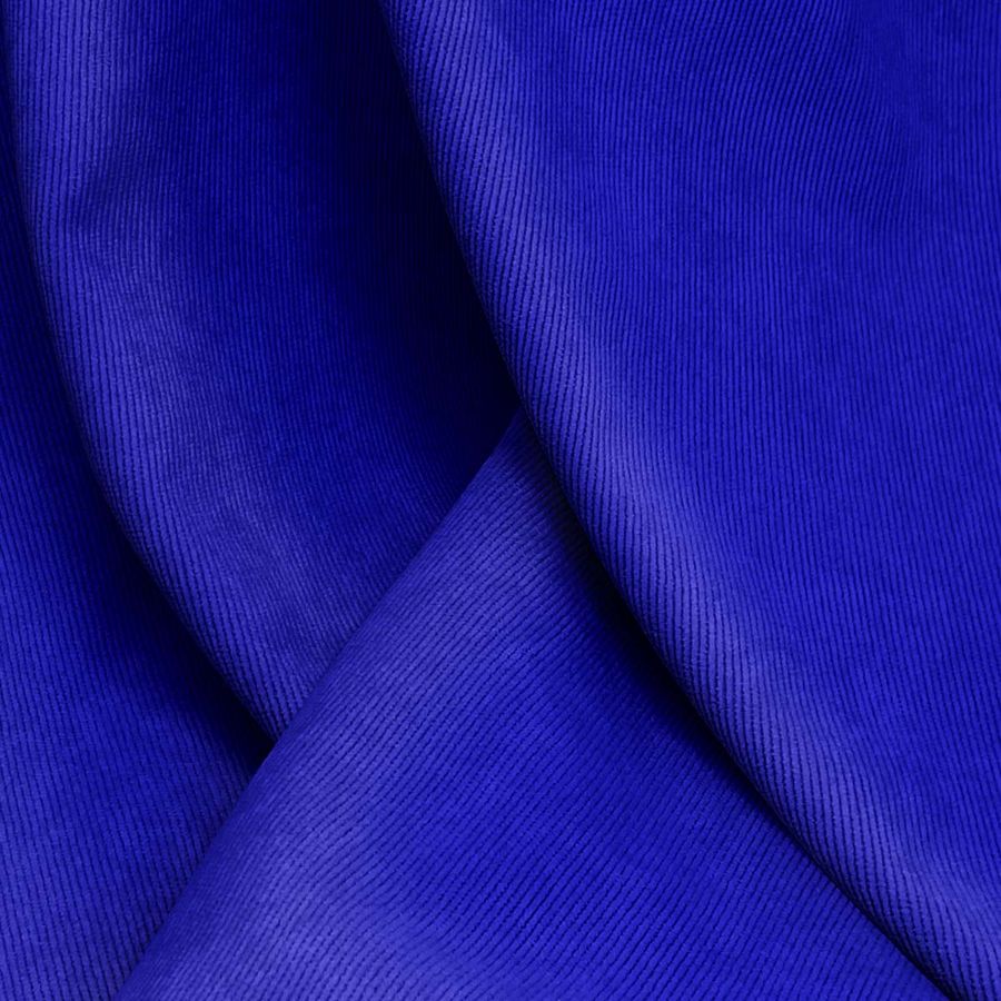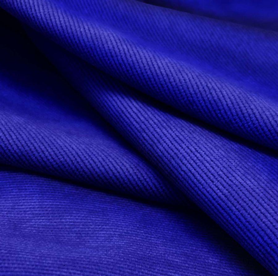 La tela base de este tejido es una Pana Aterciopelada llamada Dublin, compuesta por 85% de poliéster, 12% de poliamida y 3% de elastano. Se presenta en un ancho de 150 cm y un gramaje de 280 gr/m2. Está impresa con un color liso en tonalidad Azul Tinta, que se logra con una combinación en CMYK de 100 92 21 6. Esta tonalidad de Azul Tinta transmite elegancia y sofisticación, y combina especialmente bien con colores como el blanco, el negro, el gris y el rosa palo.