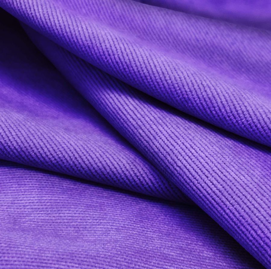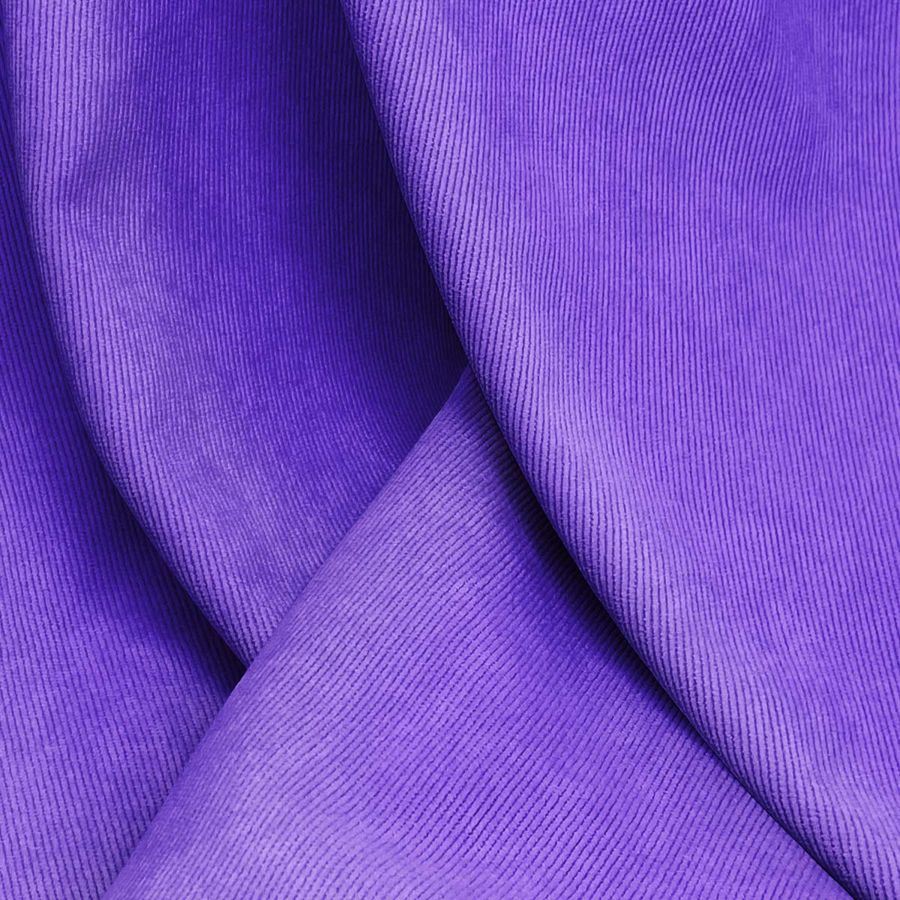 La tela base es una suave y aterciopelada pana Dublin compuesta por un 85% de poliéster, un 12% de poliamida y un 3% de elastano, con un gramaje de 280 gr/m2 y una anchura de 150 cm. El color liso impreso en la tela es un tono azul uva con una combinación CMYK de 79-77-0-0, que otorga un efecto visual brillante y suave al tacto. Este color combina perfectamente con tonos neutros como blancos, grises o negros, así como con otros tonos de azules o morados.