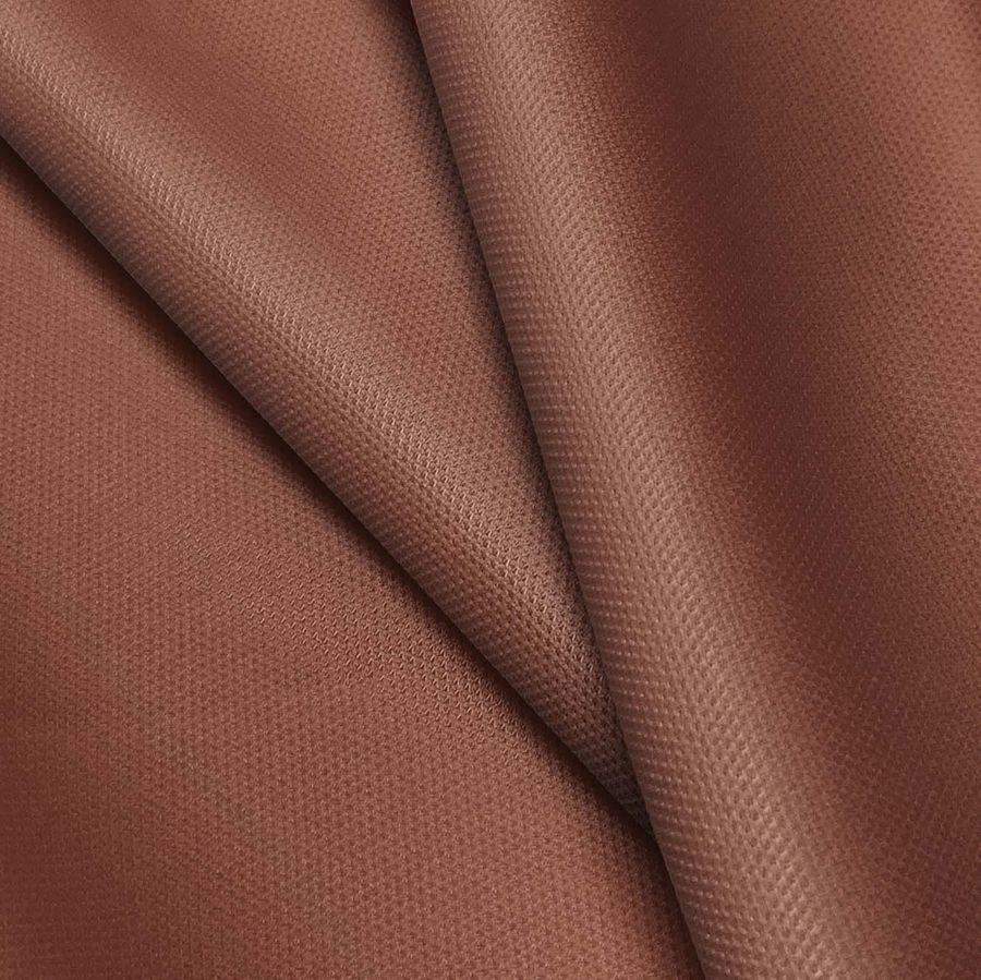 La tela base de este tejido es un Piqué para Polo - Durban, de composición 100% poliéster, con un gramaje de 180gr/m2 y un ancho de 150cm. El color liso impreso en el tejido es un Marrón Cedro, cuyos valores CMYK son 36 76 78 52. Este color se describe como un tono cálido y tierra, que evoca sensaciones de estabilidad y robustez. Combina especialmente bien con colores como el beige, el granate, el naranja y el amarillo mostaza.