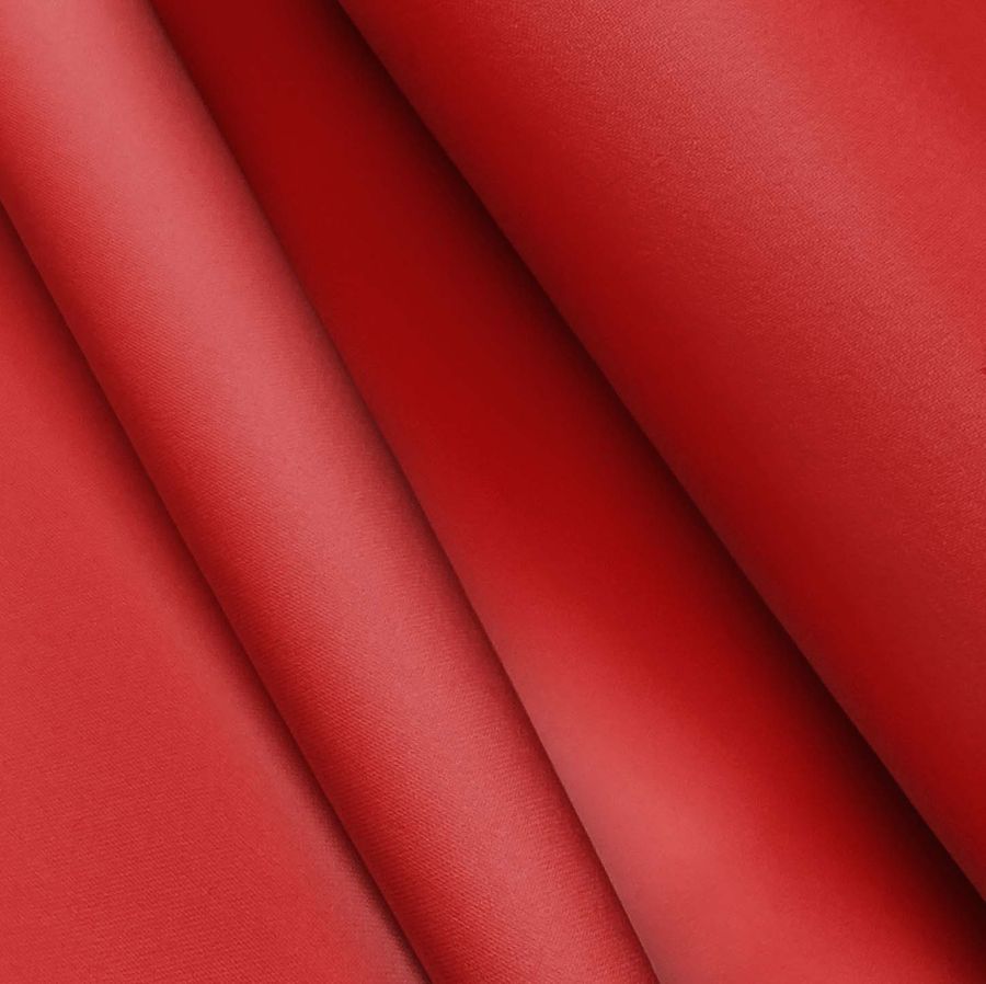 La tela base es el Poliester Reciclado Deportivo - Basic, compuesta por un 93% de poliéster y un 7% de elastómero con un gramaje de 145 gr/m2 y un ancho de 145 cm. Su color liso impreso presenta una tonalidad Rojo Sangre, con un CMYK de 18 100 100 8. Este color transmite pasión y energía, simbolizando la vitalidad y el coraje. Es un color intenso que se combina bien con tonalidades oscuras como el negro e incluso con tonos claros como el blanco o el beige. Es importante mencionar que la tela está impresa con el color liso a una sola cara por impresión digital textil.