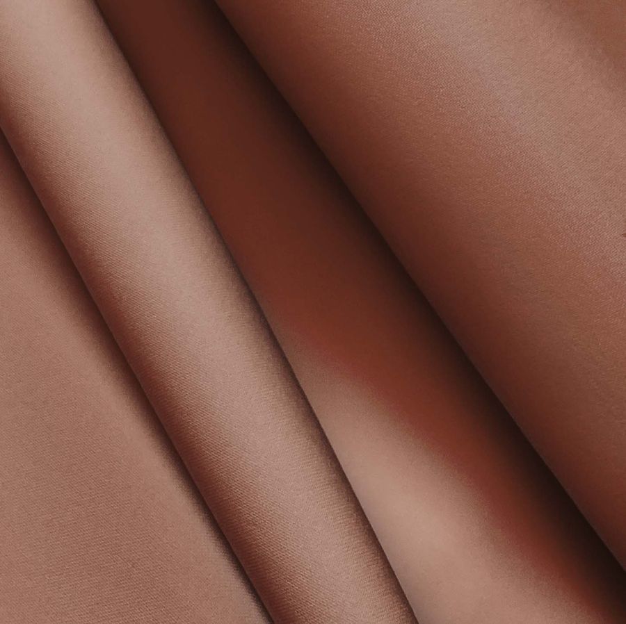La tela base es el Poliester Reciclado Deportivo - Basic, con una composición de 93% poliéster y 7% elastómero, un gramaje de 145 gr/m2 y un ancho de 145 cm. El color liso impreso en esta tela es de un marrón con un toque de pátina, con un CMYK de 33 65 67 38. Este color evoca una sensación de tierra y naturaleza, simbolizando estabilidad y calidez.